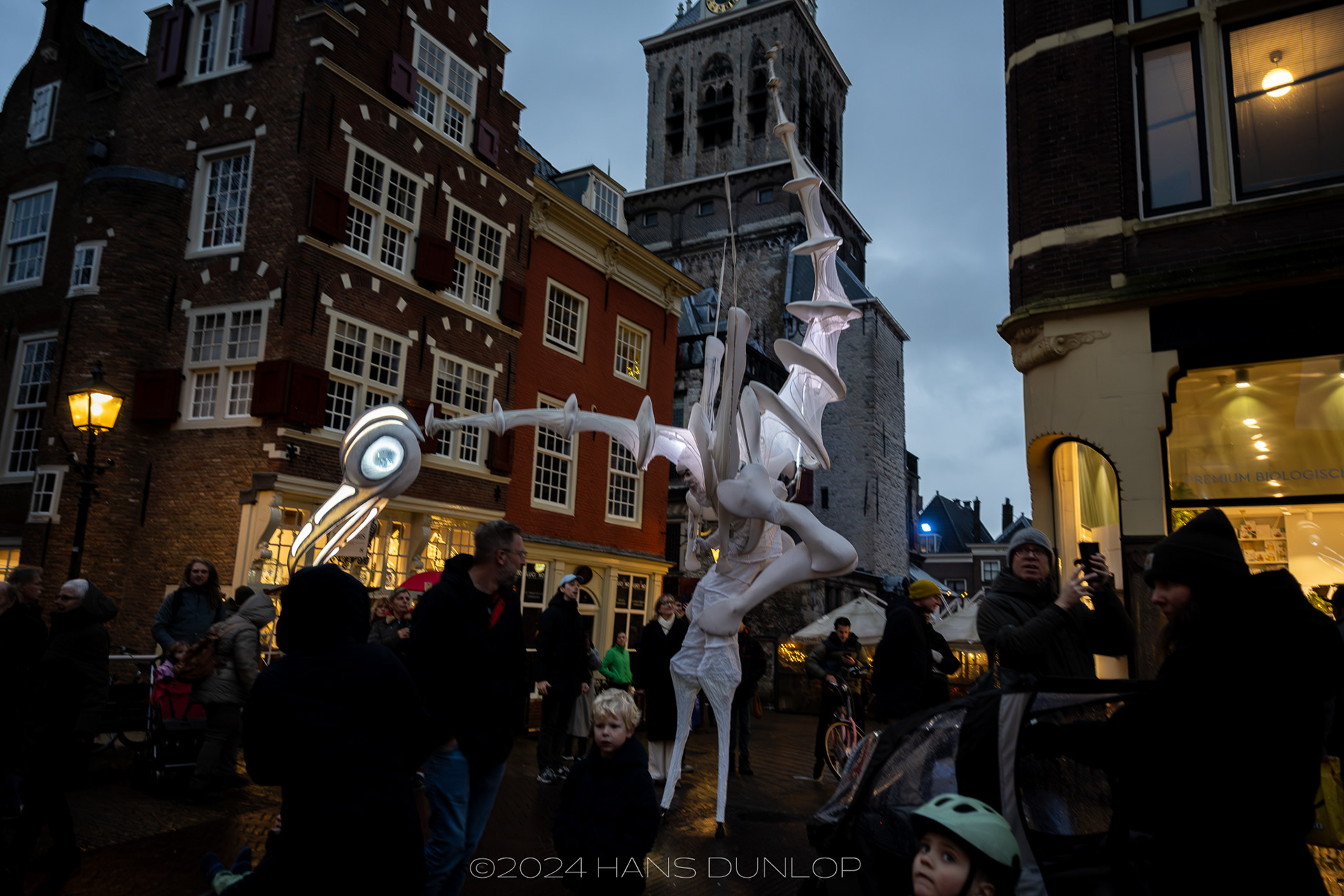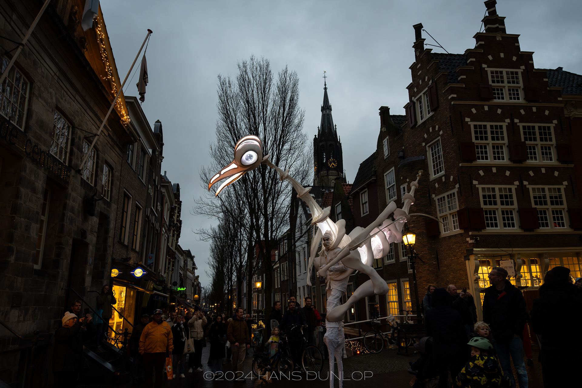 Birdmen maakten de straten van Historisch Centrum Delft (De Klis) onveilig. "Flying animals Huge illuminated animals rove the streets. These flying animals are operated by mysterious men. We humans are unnoticed by these creatures. Are they living in another dimension and what is their reason to invade our streets." https://closeact.nl/production/birdmen/ https://mooiweerspelen.nl/