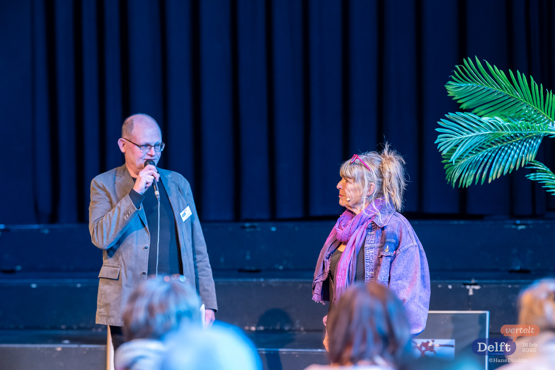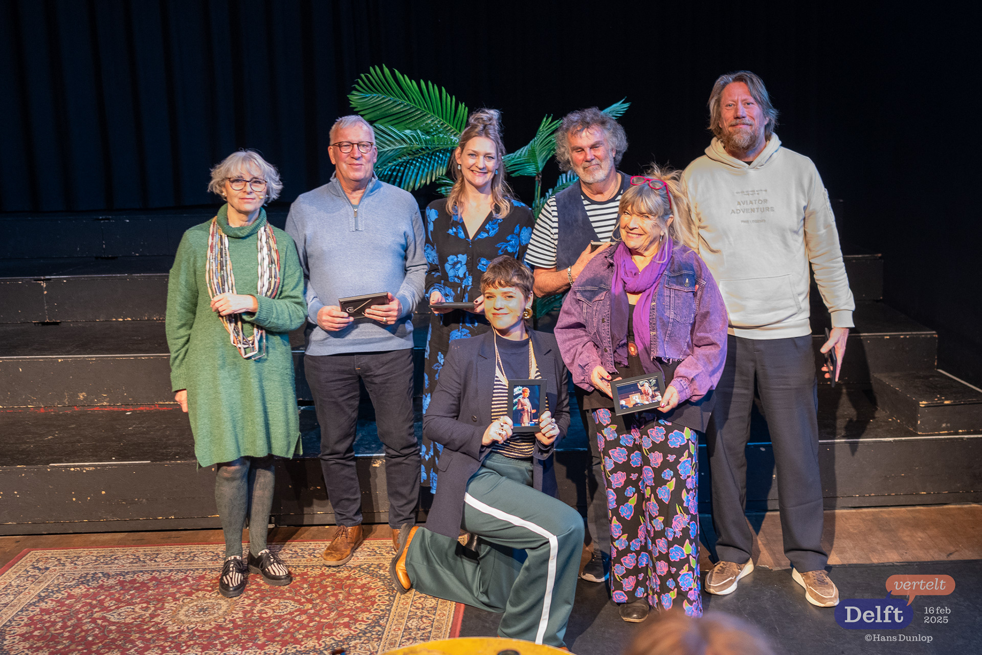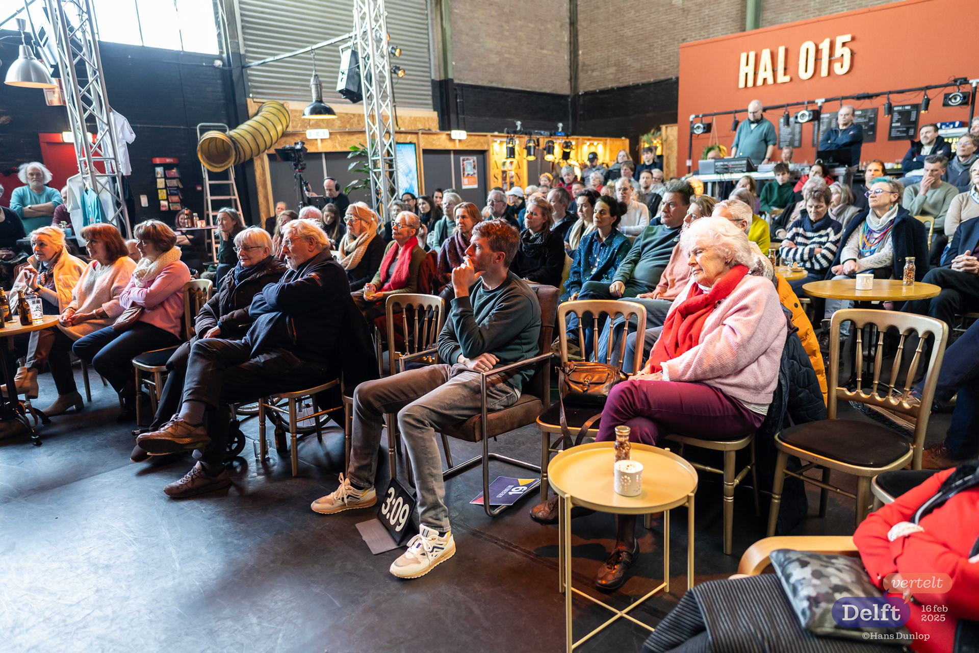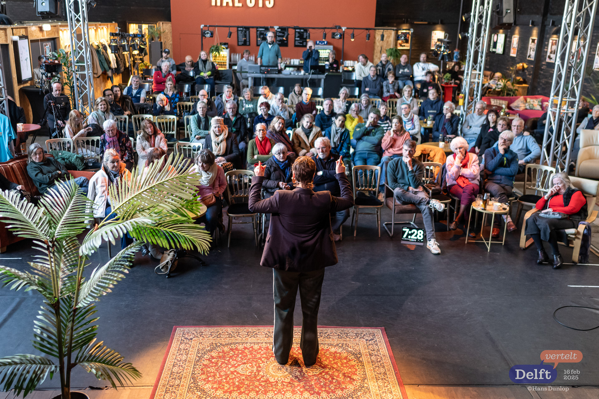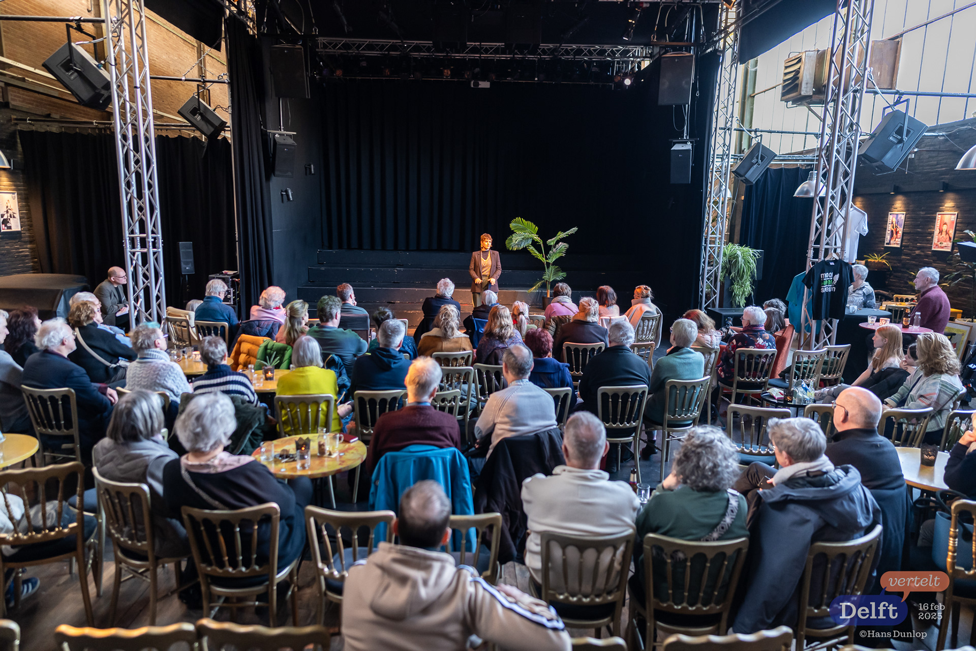 Delft Vertelt editie 34 op 16 februari 2025 in HAL015, met: Cees van Laren; Gerard Jellema; Ida Bastiaansen; Loda Stikkelman; Luca Warmer; Martine Muller; Rob Lenting; Ton & Ida;