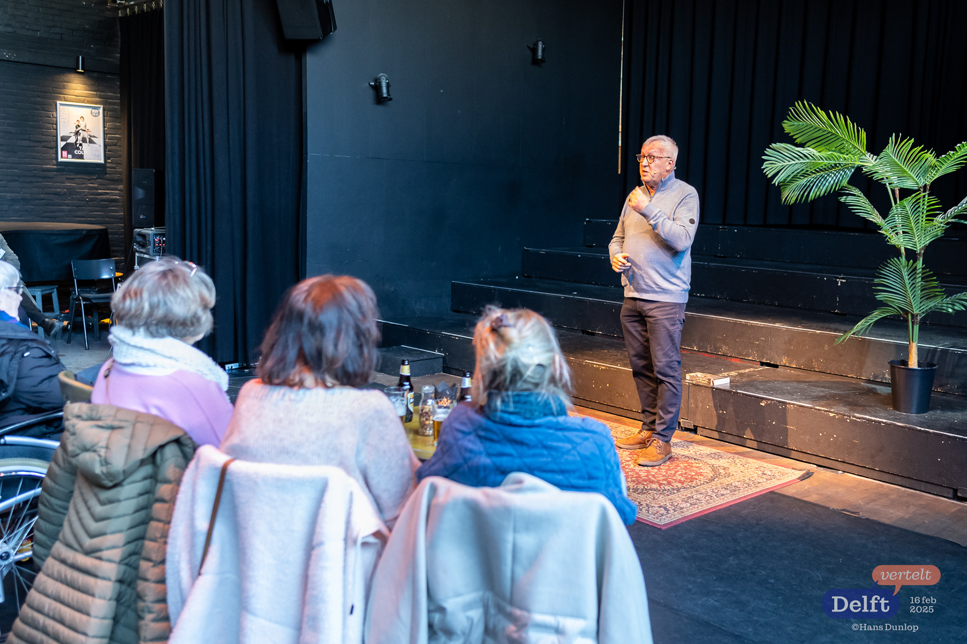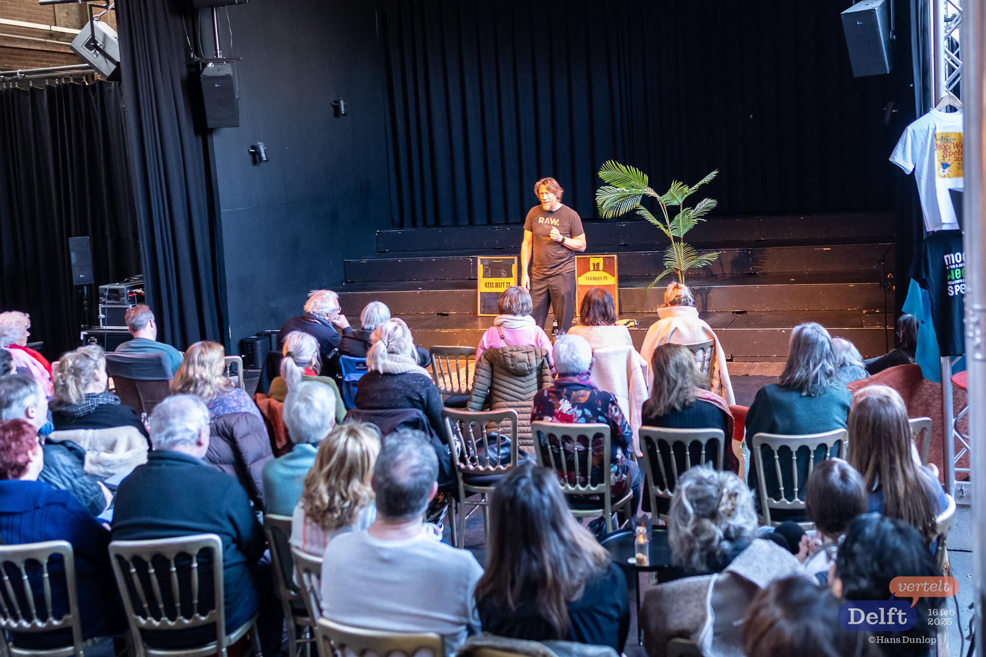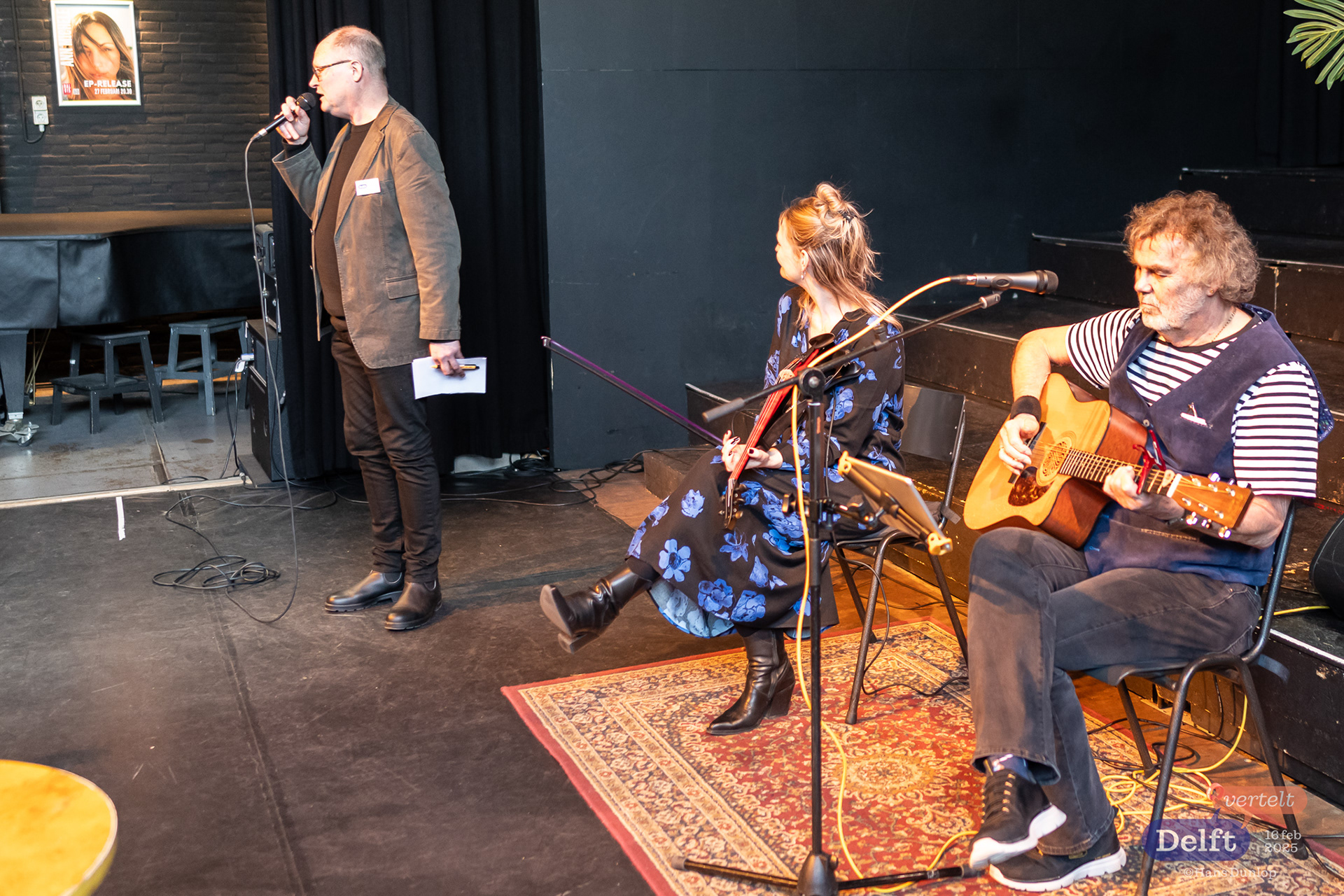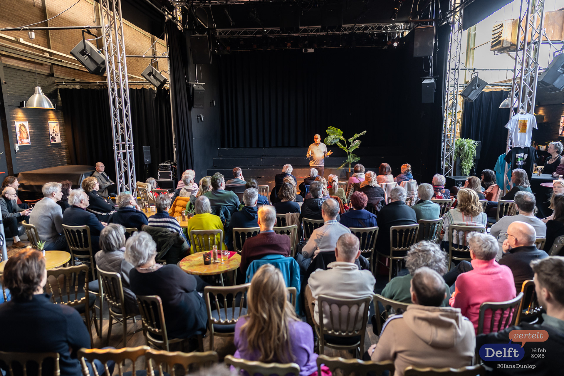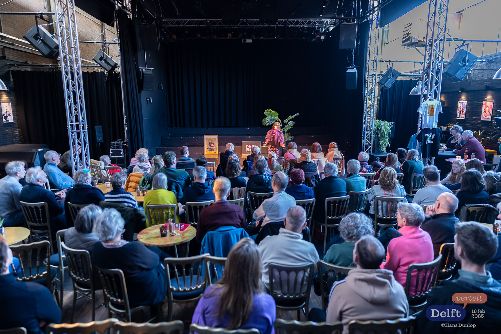 Delft Vertelt editie 34 op 16 februari 2025 in HAL015, met: Cees van Laren; Gerard Jellema; Ida Bastiaansen; Loda Stikkelman; Luca Warmer; Martine Muller; Rob Lenting; Ton & Ida;