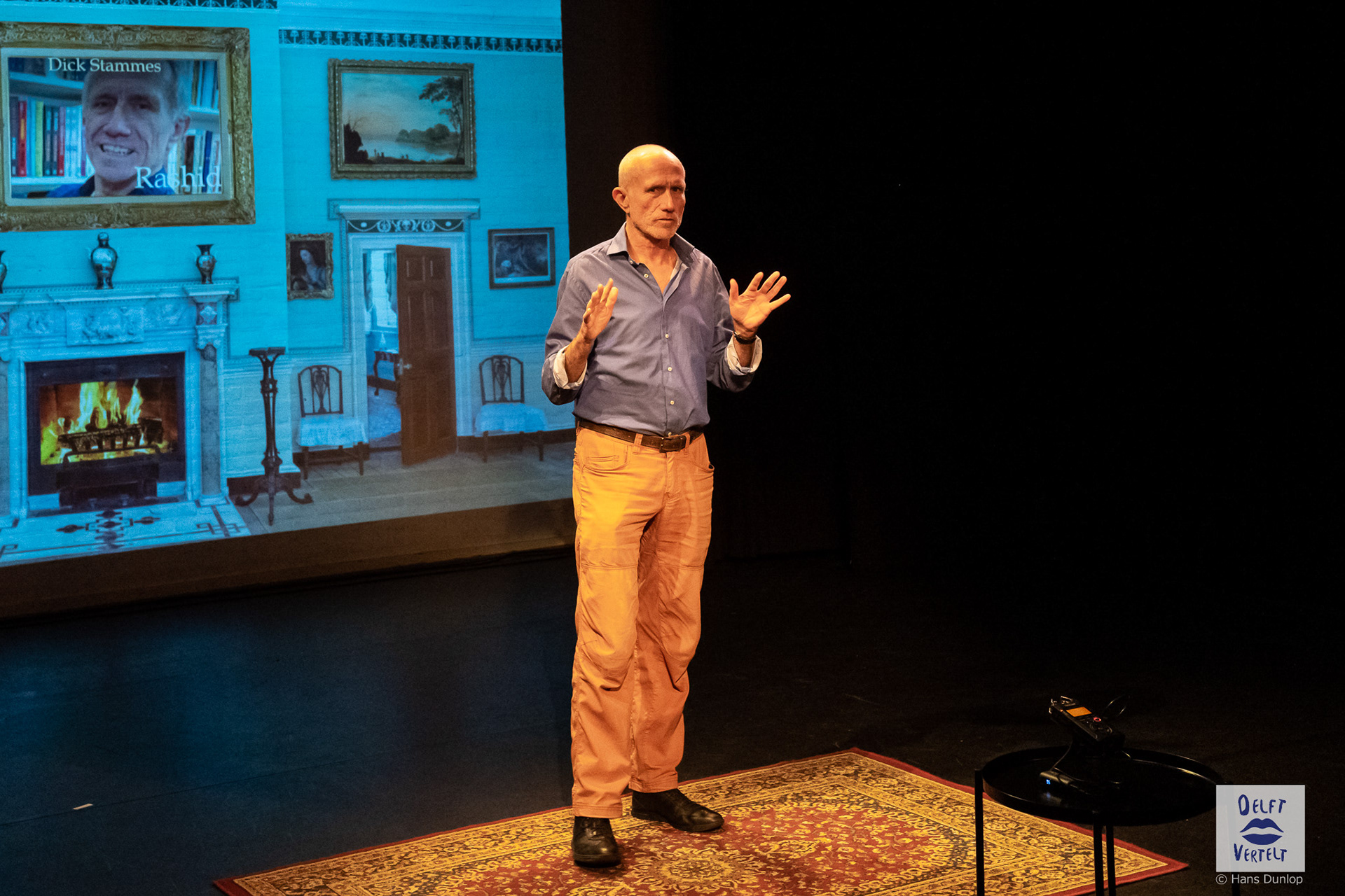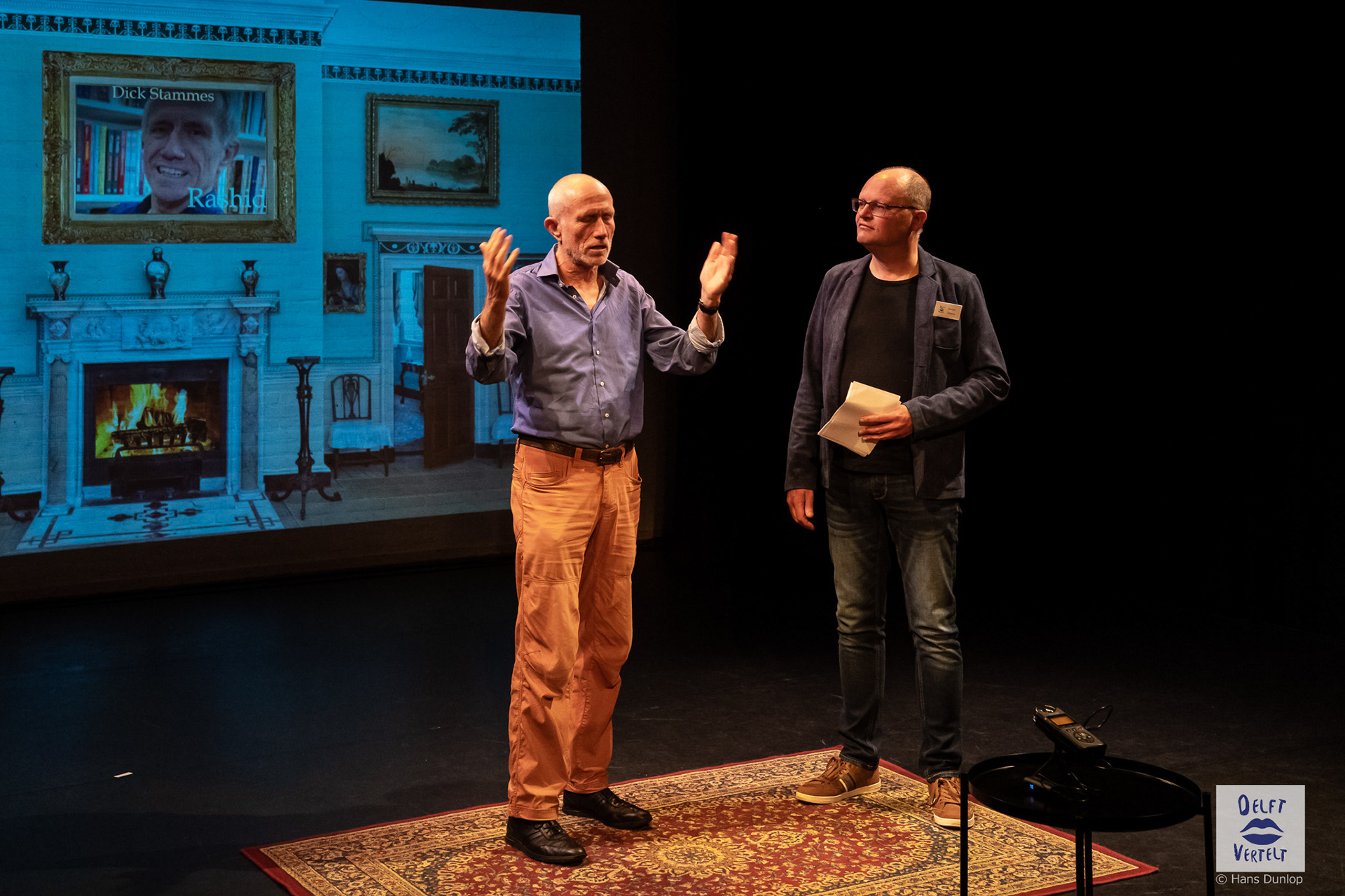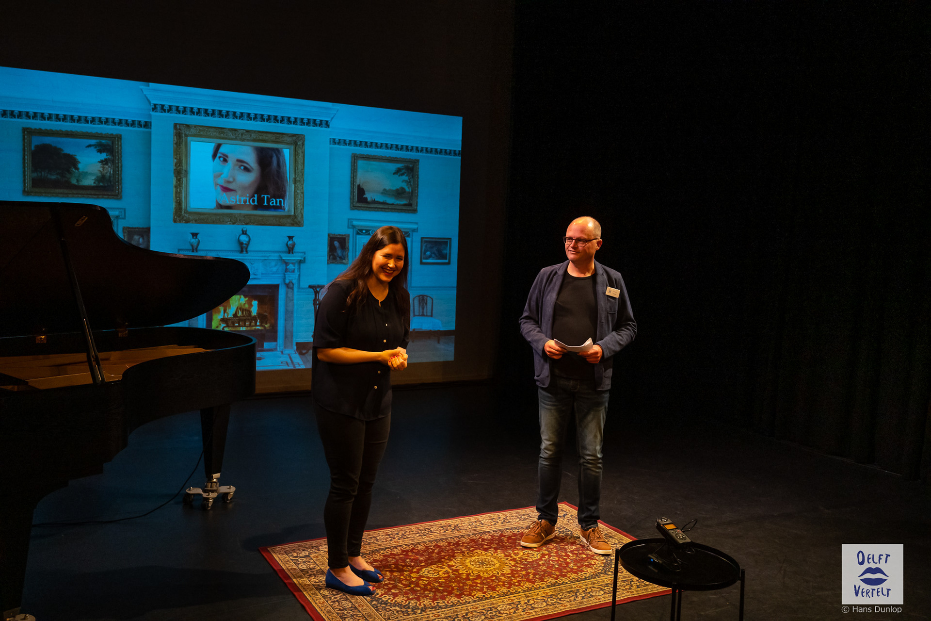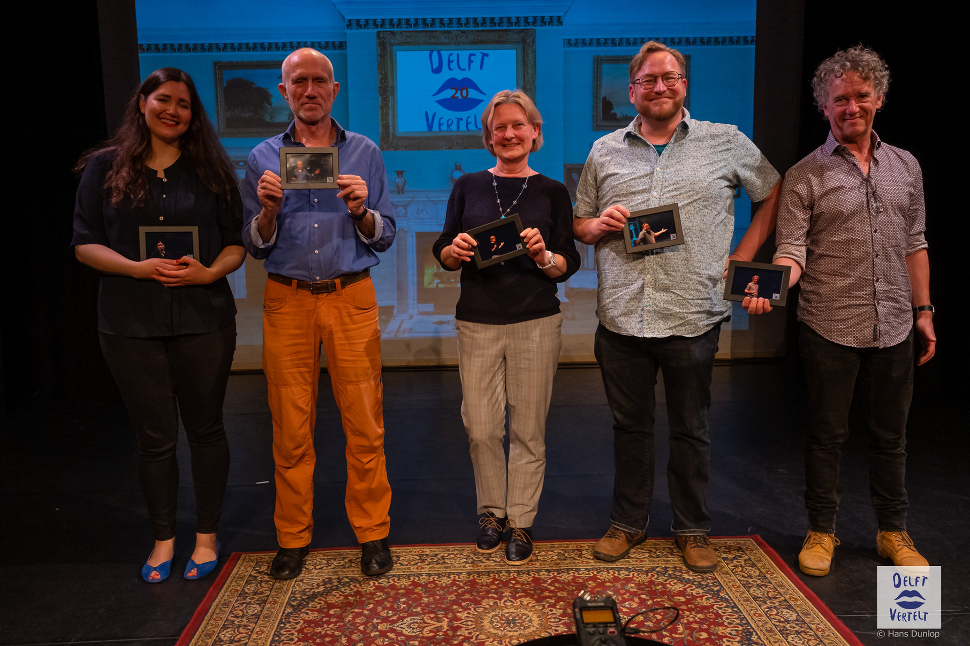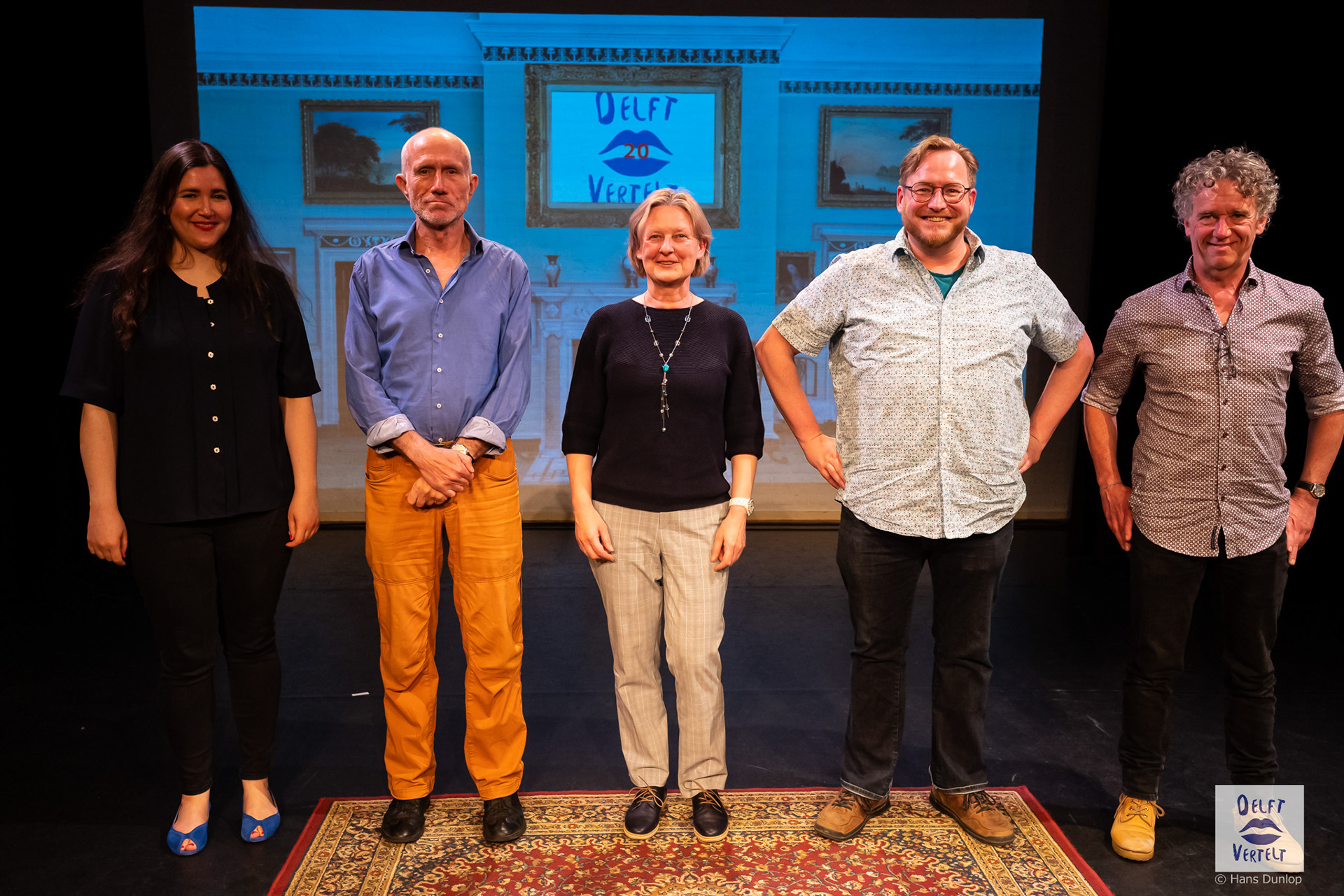 Een impressie van de 20e voorstelling van Delft Vertelt in het Rietveld Theater met Tjan van Loenen, Séphine Laros, Ric Berretty, Astrid Tan en Dick Stammes.