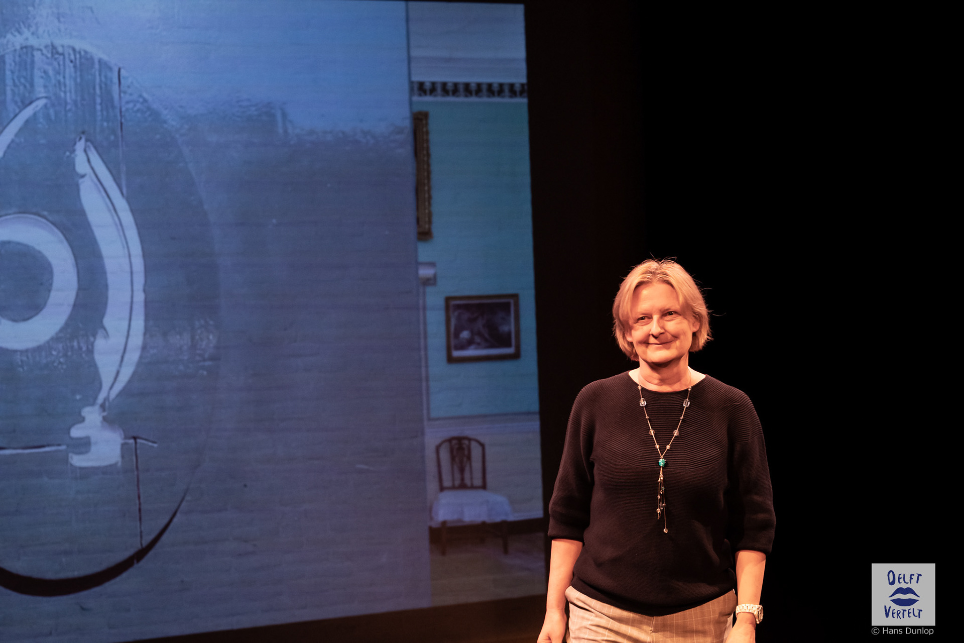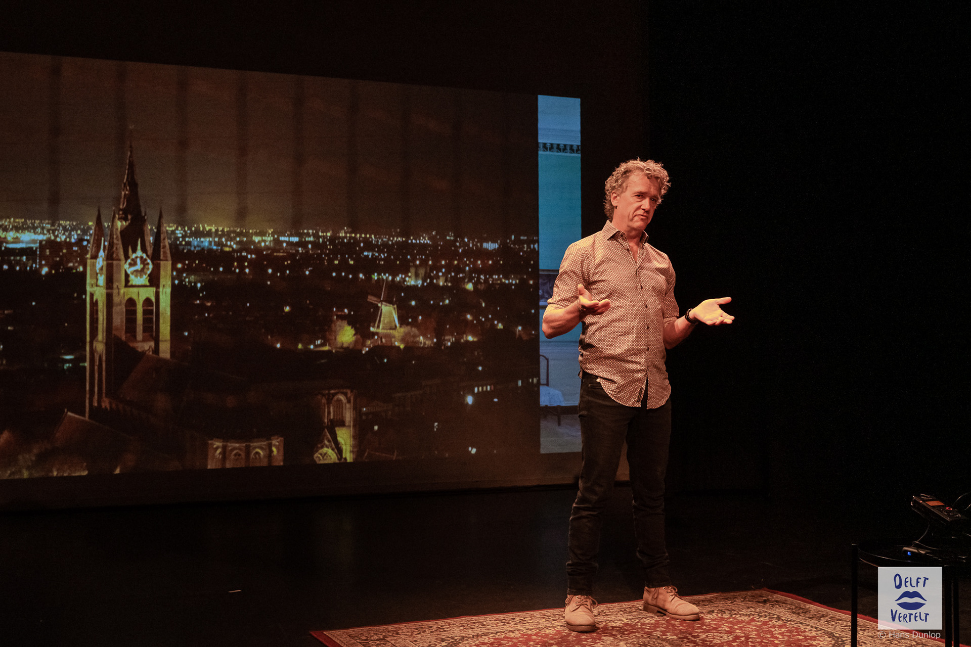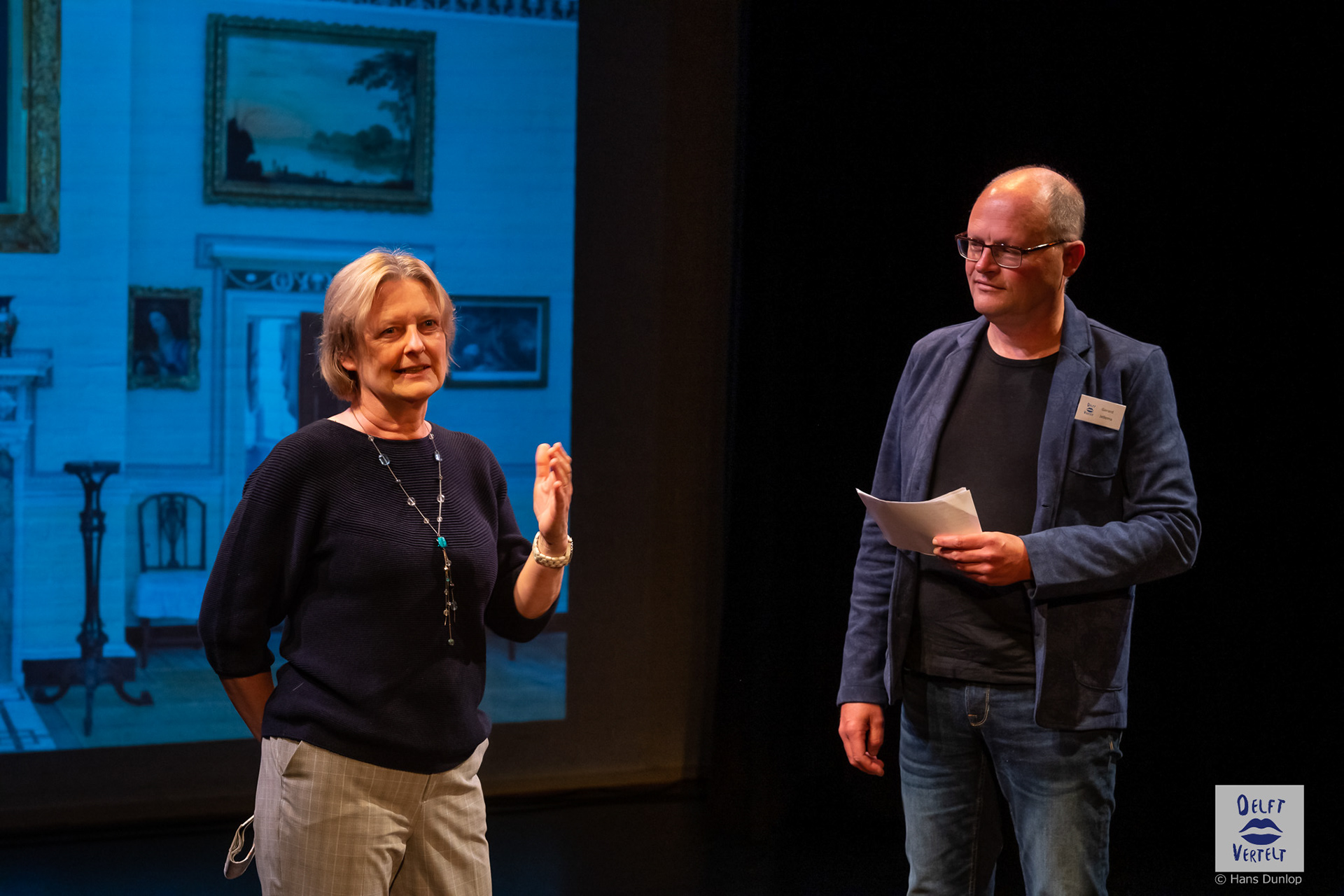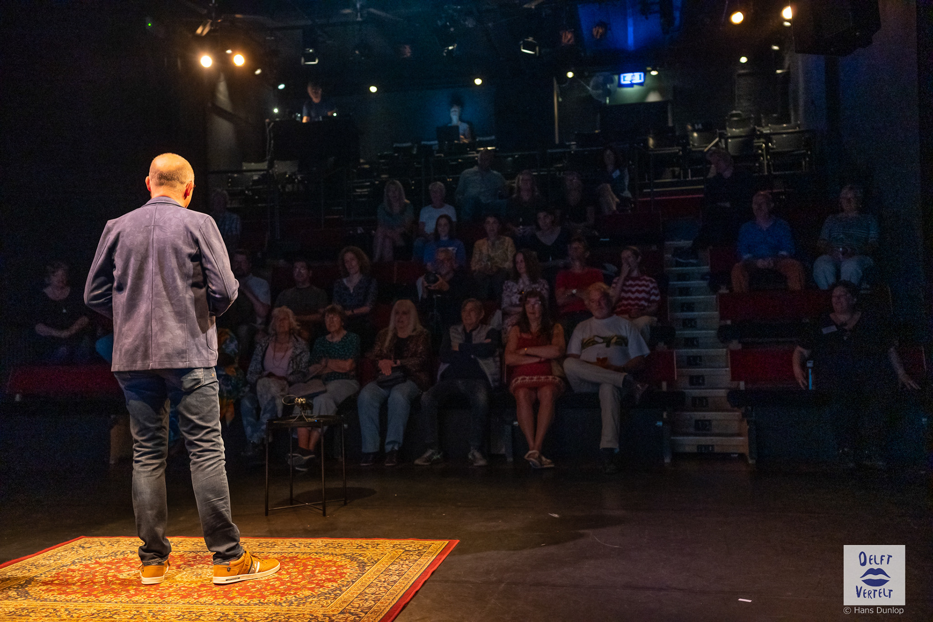 Een impressie van de 20e voorstelling van Delft Vertelt in het Rietveld Theater met Tjan van Loenen, Séphine Laros, Ric Berretty, Astrid Tan en Dick Stammes.