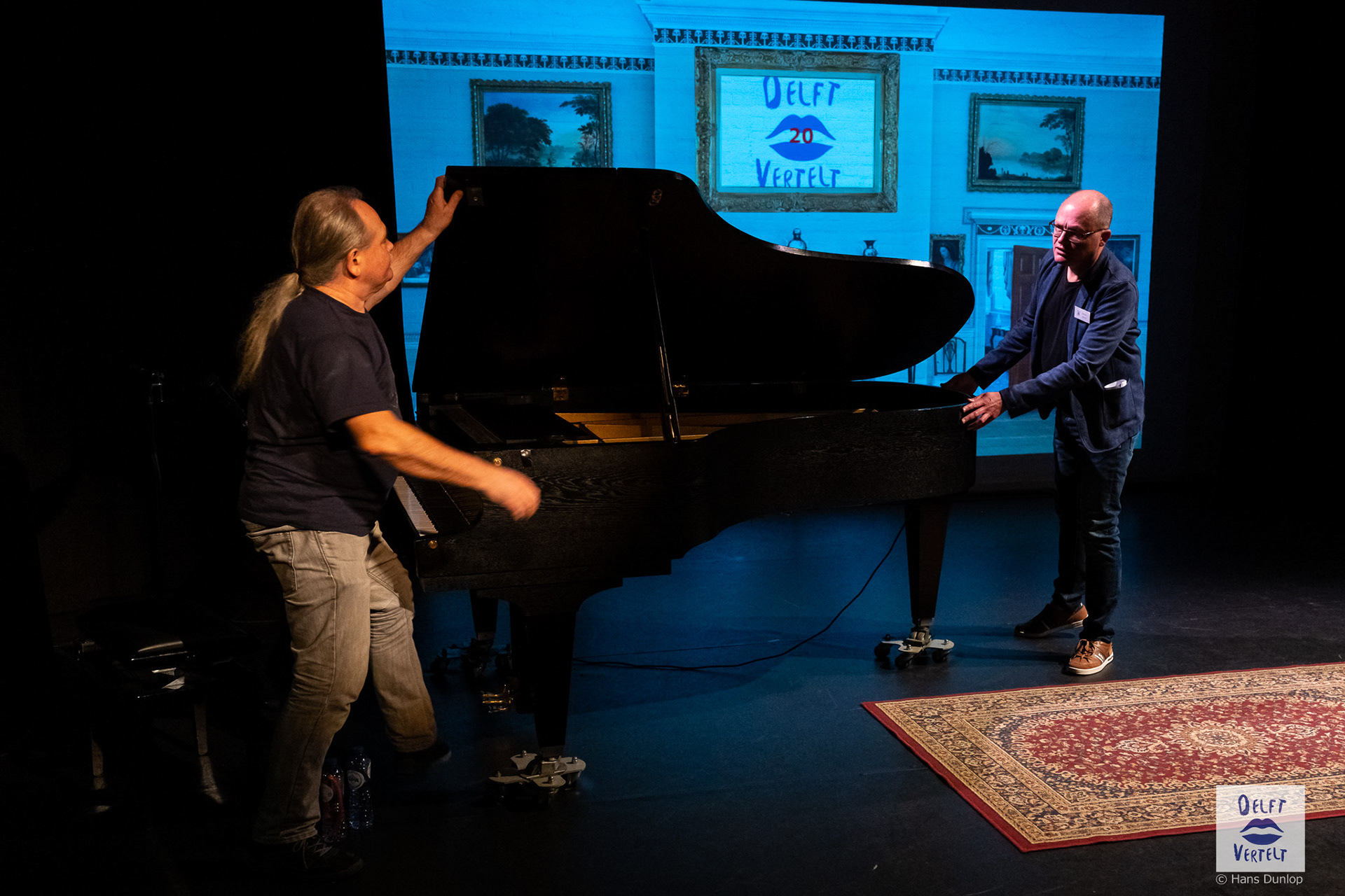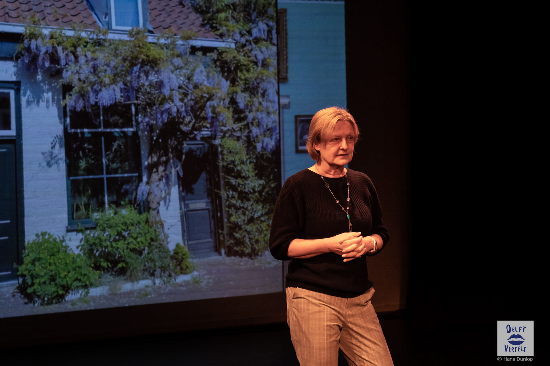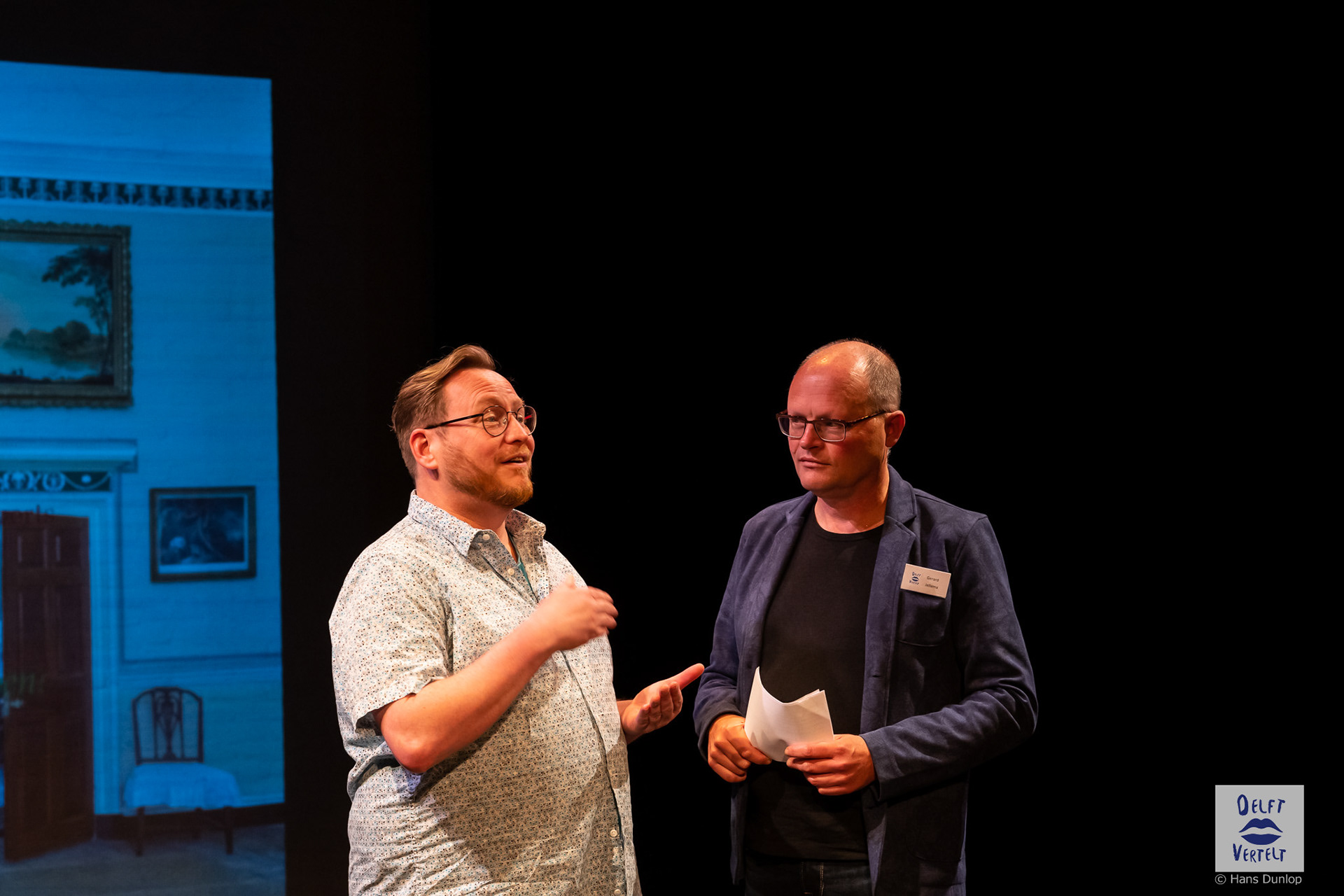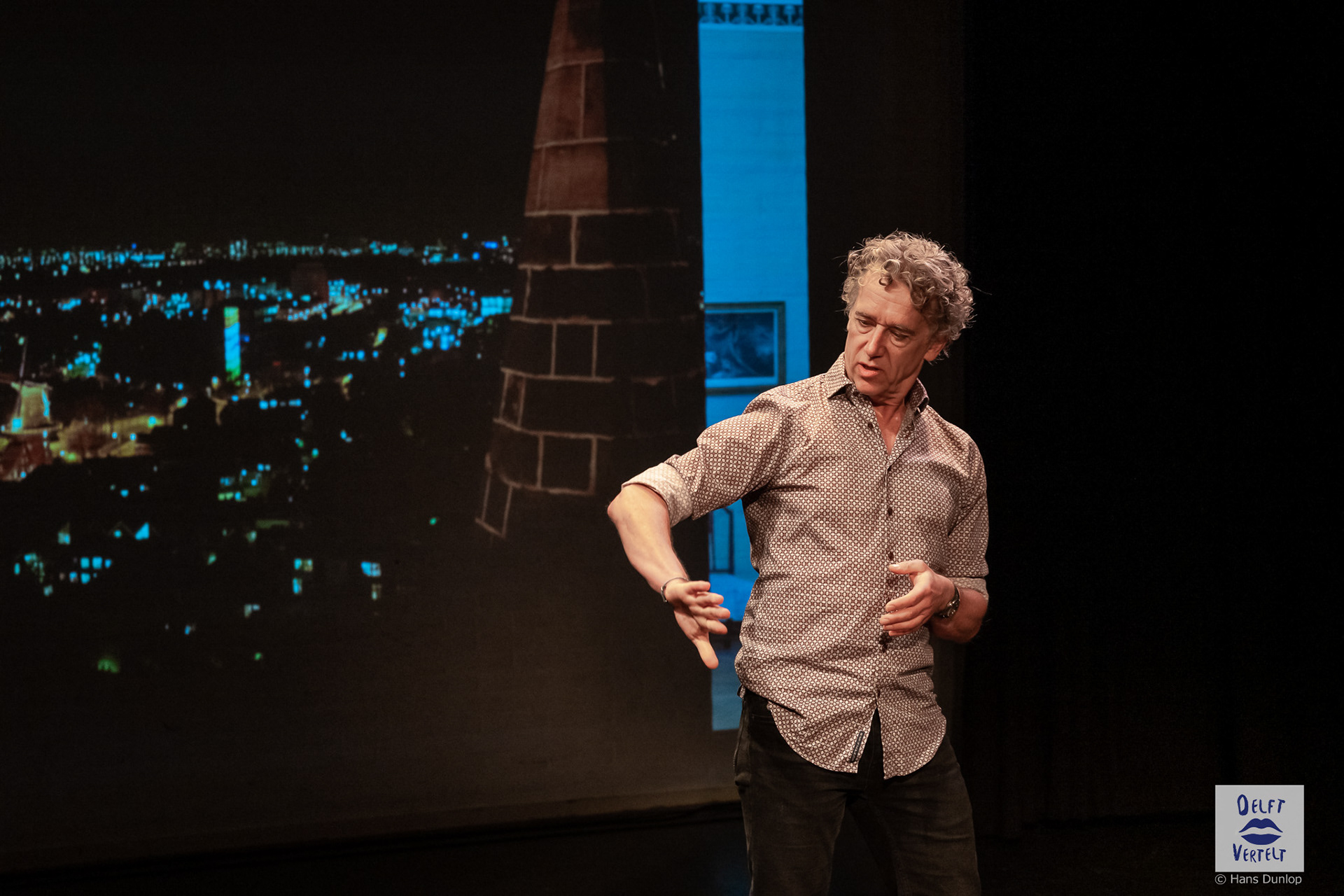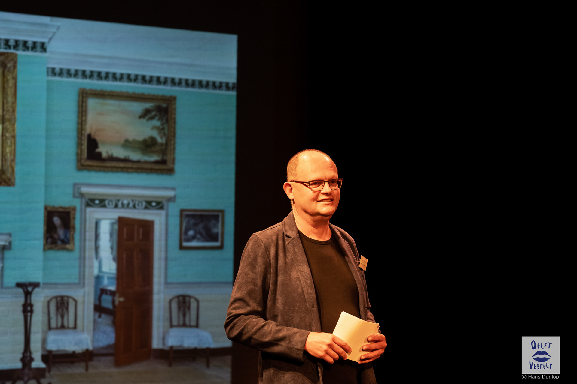 Een impressie van de 20e voorstelling van Delft Vertelt in het Rietveld Theater met Tjan van Loenen, Séphine Laros, Ric Berretty, Astrid Tan en Dick Stammes.