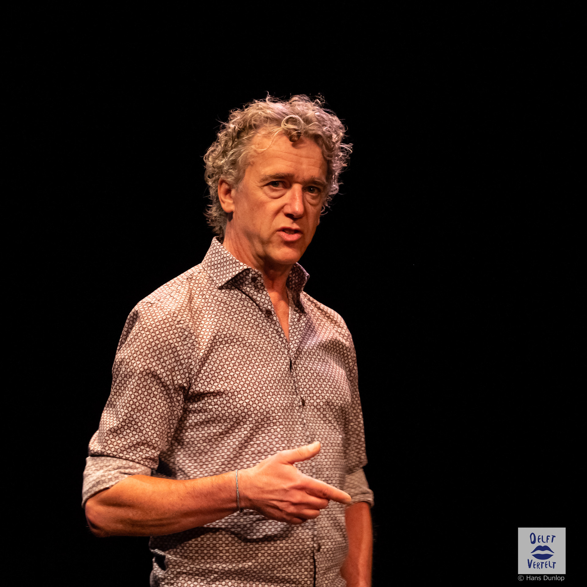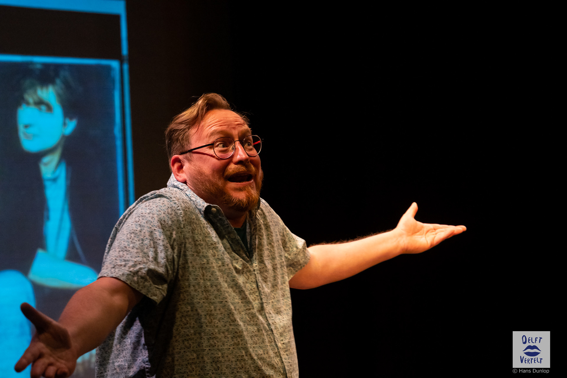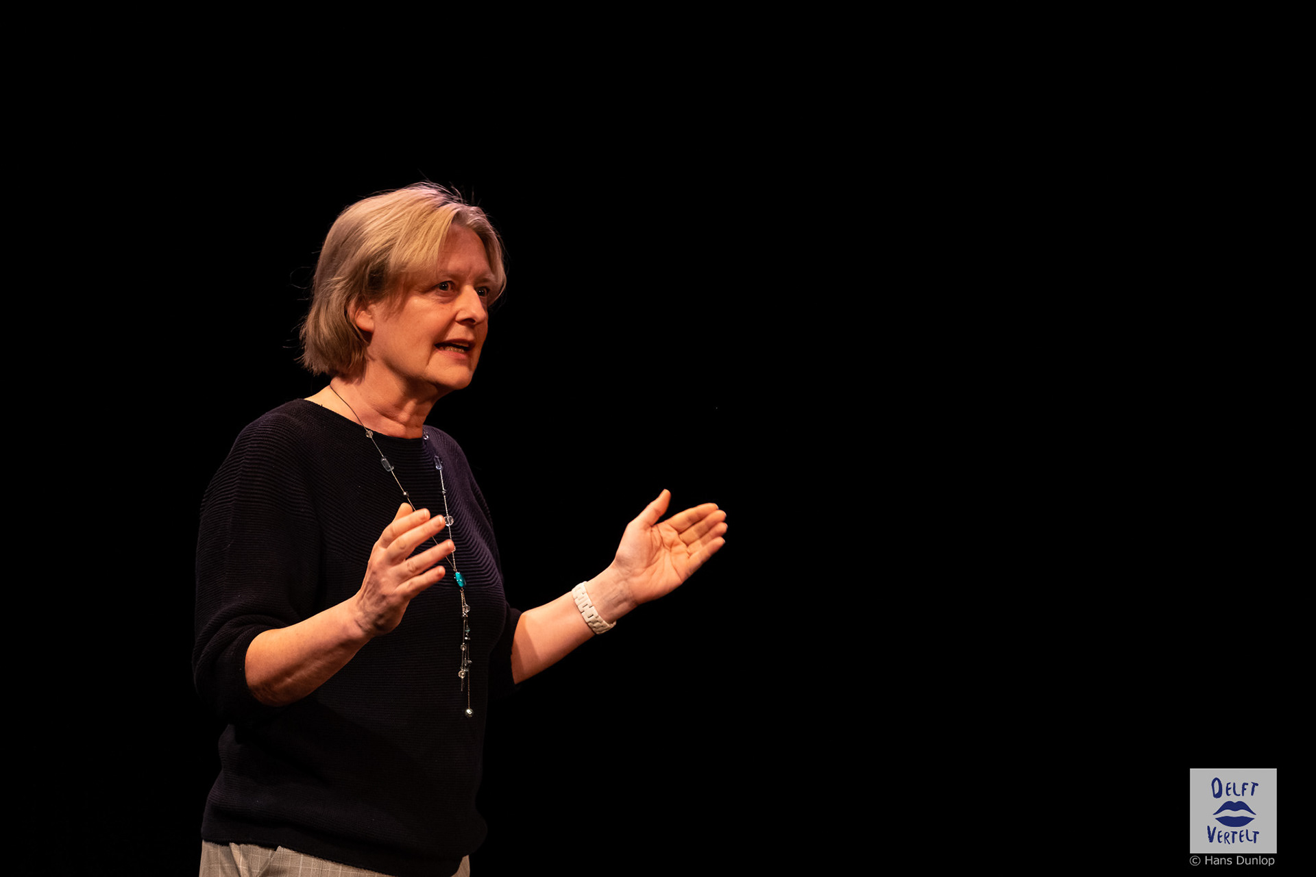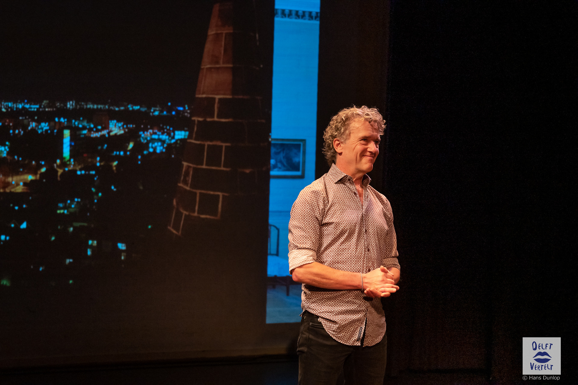 Een impressie van de 20e voorstelling van Delft Vertelt in het Rietveld Theater met Tjan van Loenen, Séphine Laros, Ric Berretty, Astrid Tan en Dick Stammes.