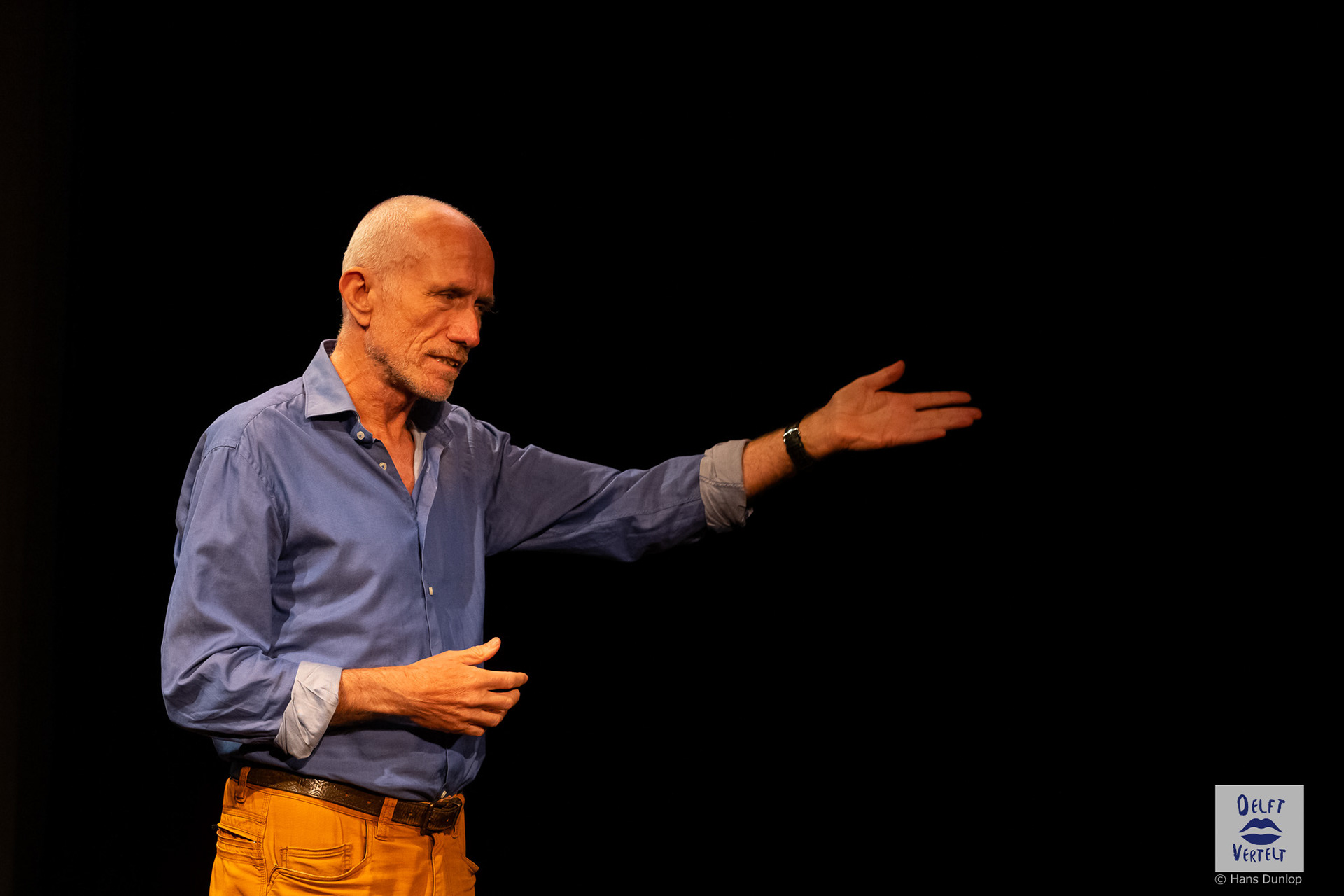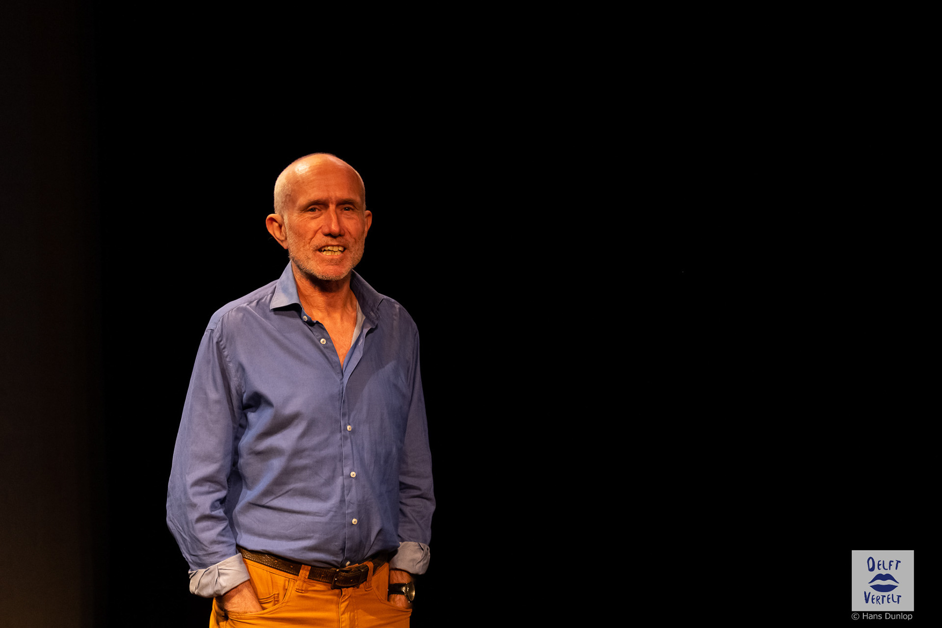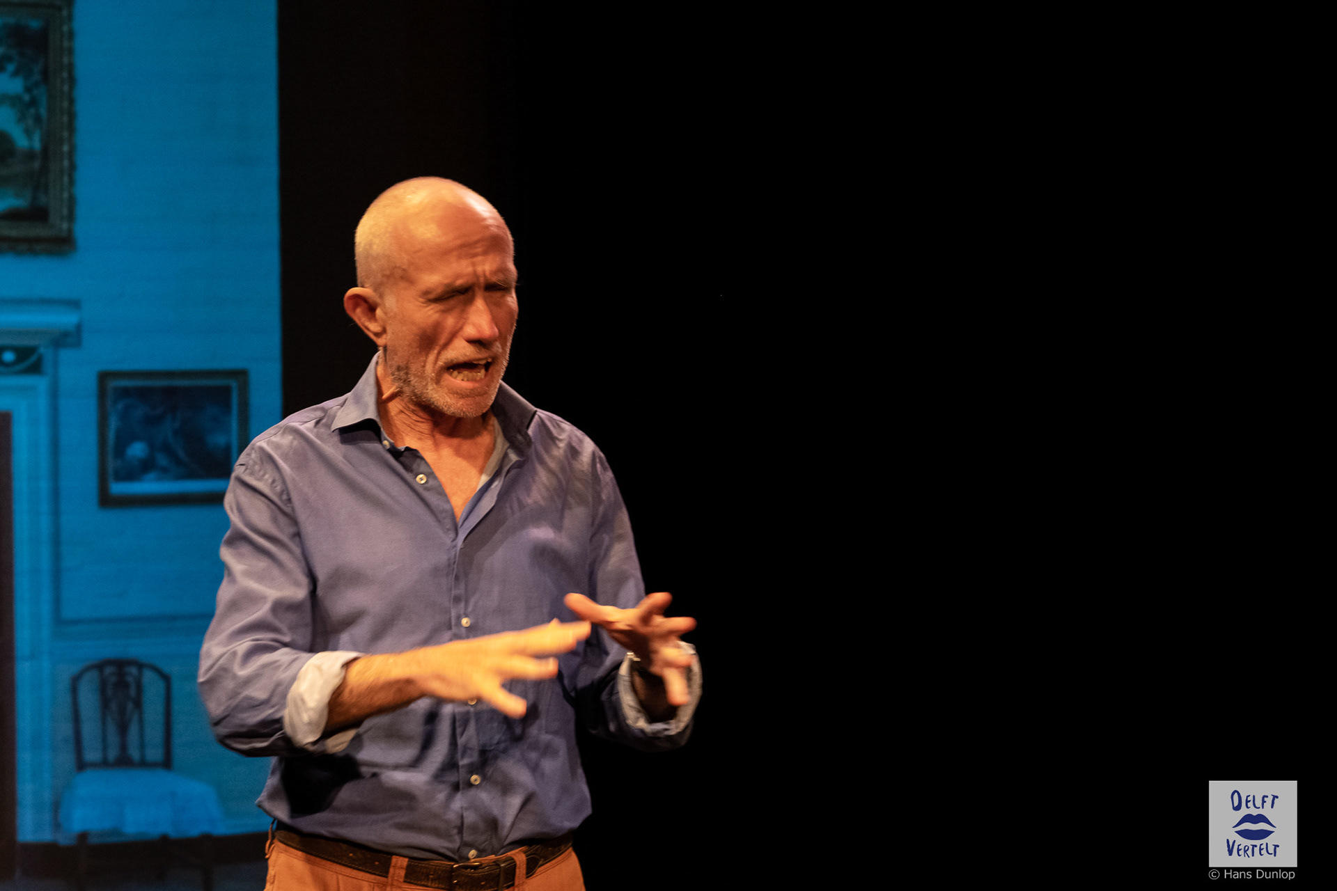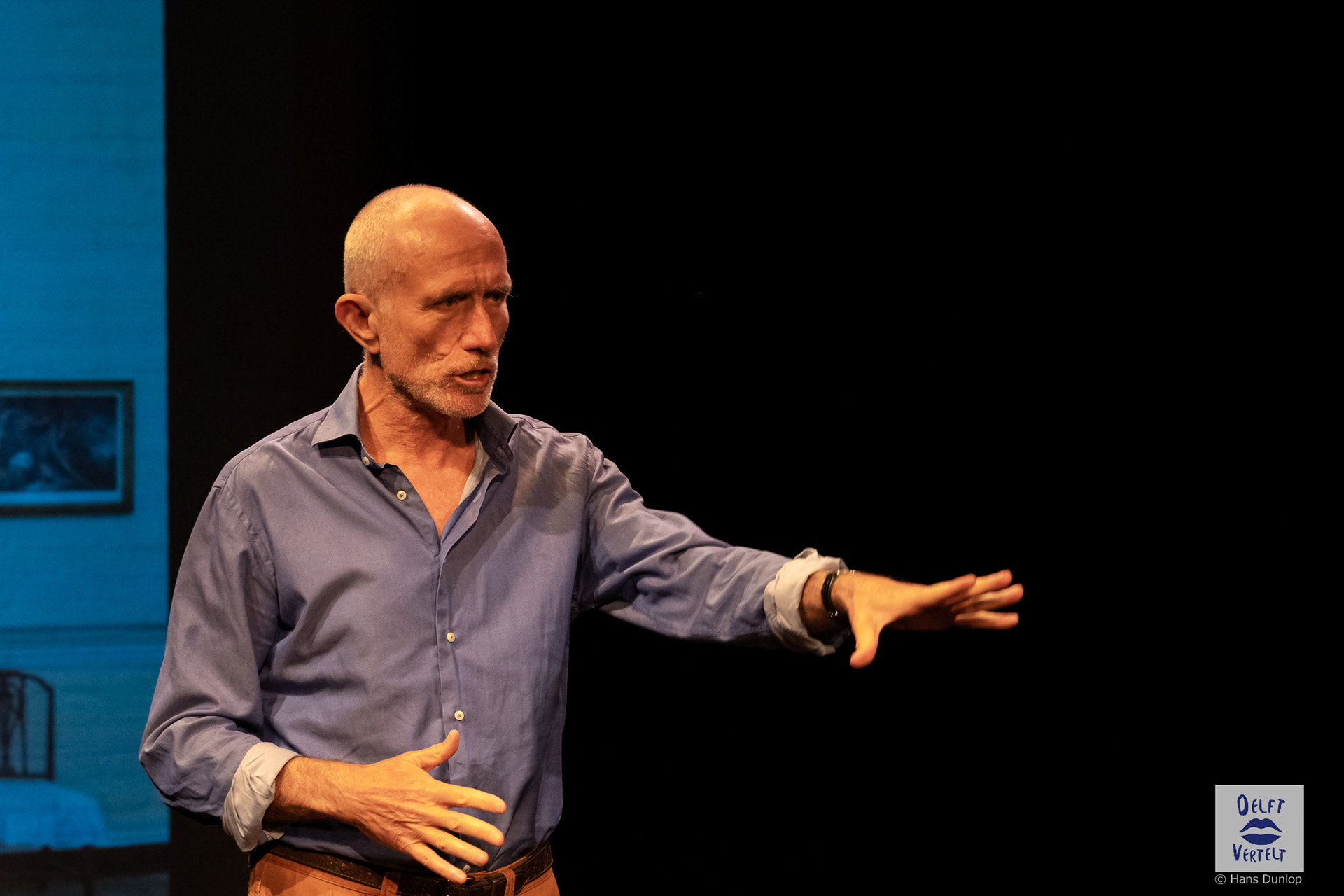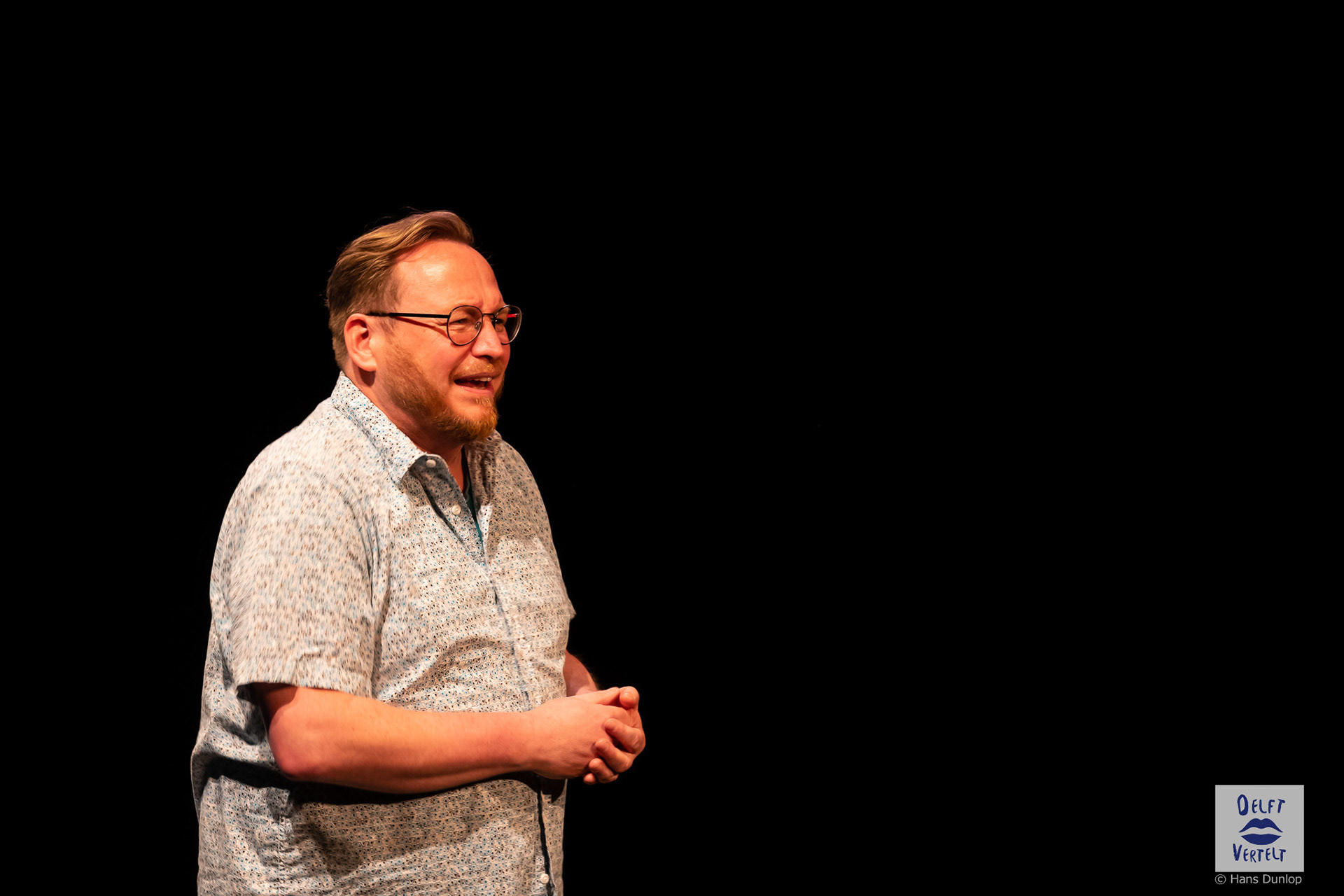 Een impressie van de 20e voorstelling van Delft Vertelt in het Rietveld Theater met Tjan van Loenen, Séphine Laros, Ric Berretty, Astrid Tan en Dick Stammes.