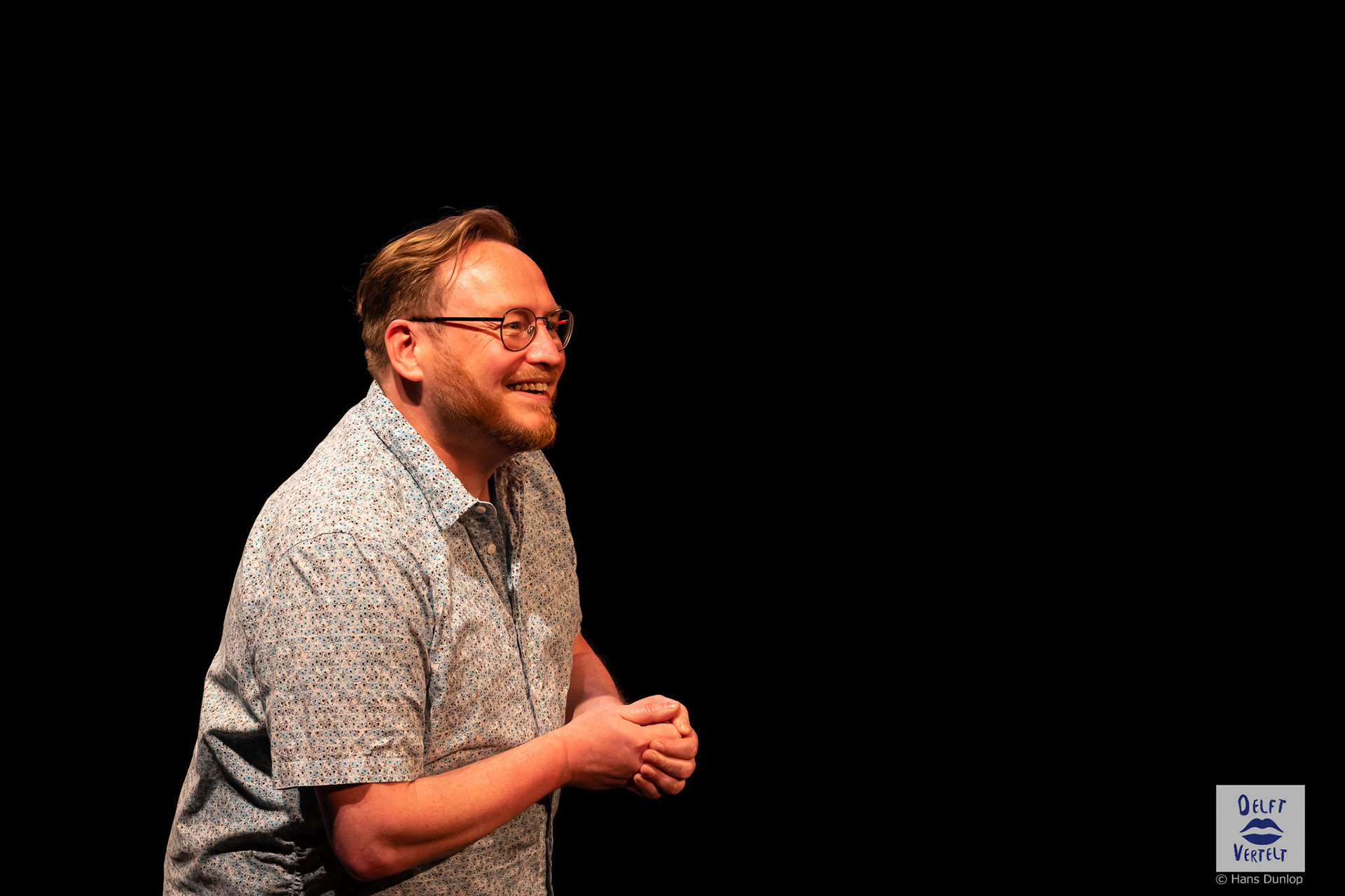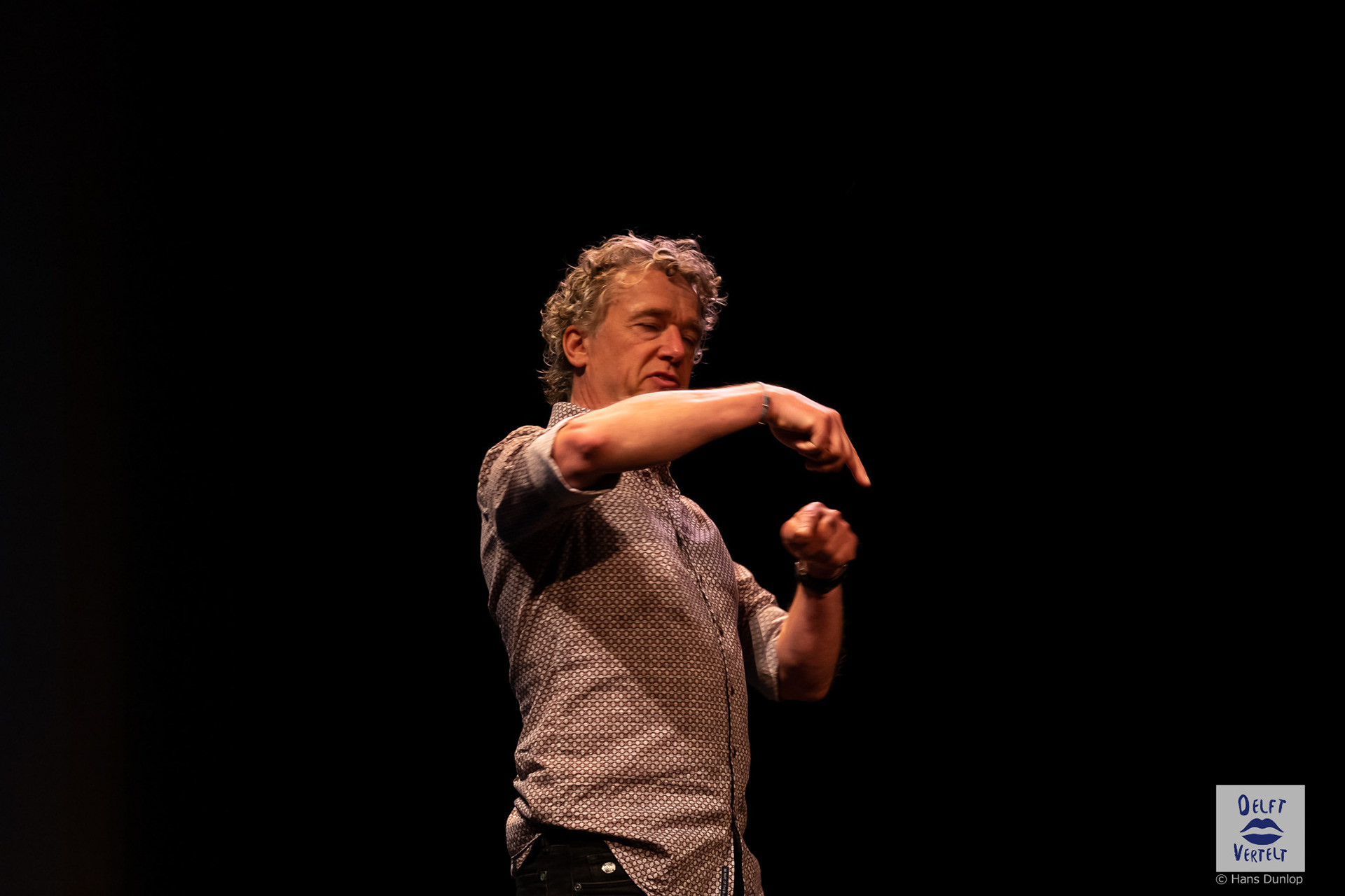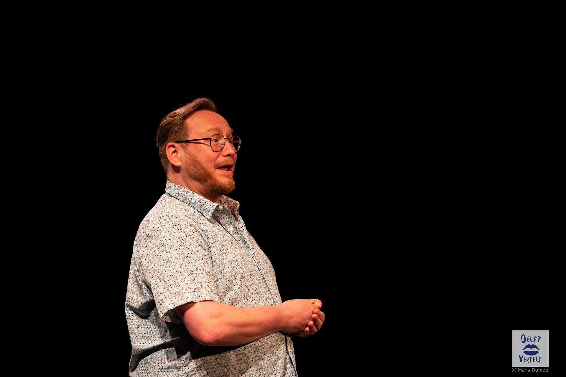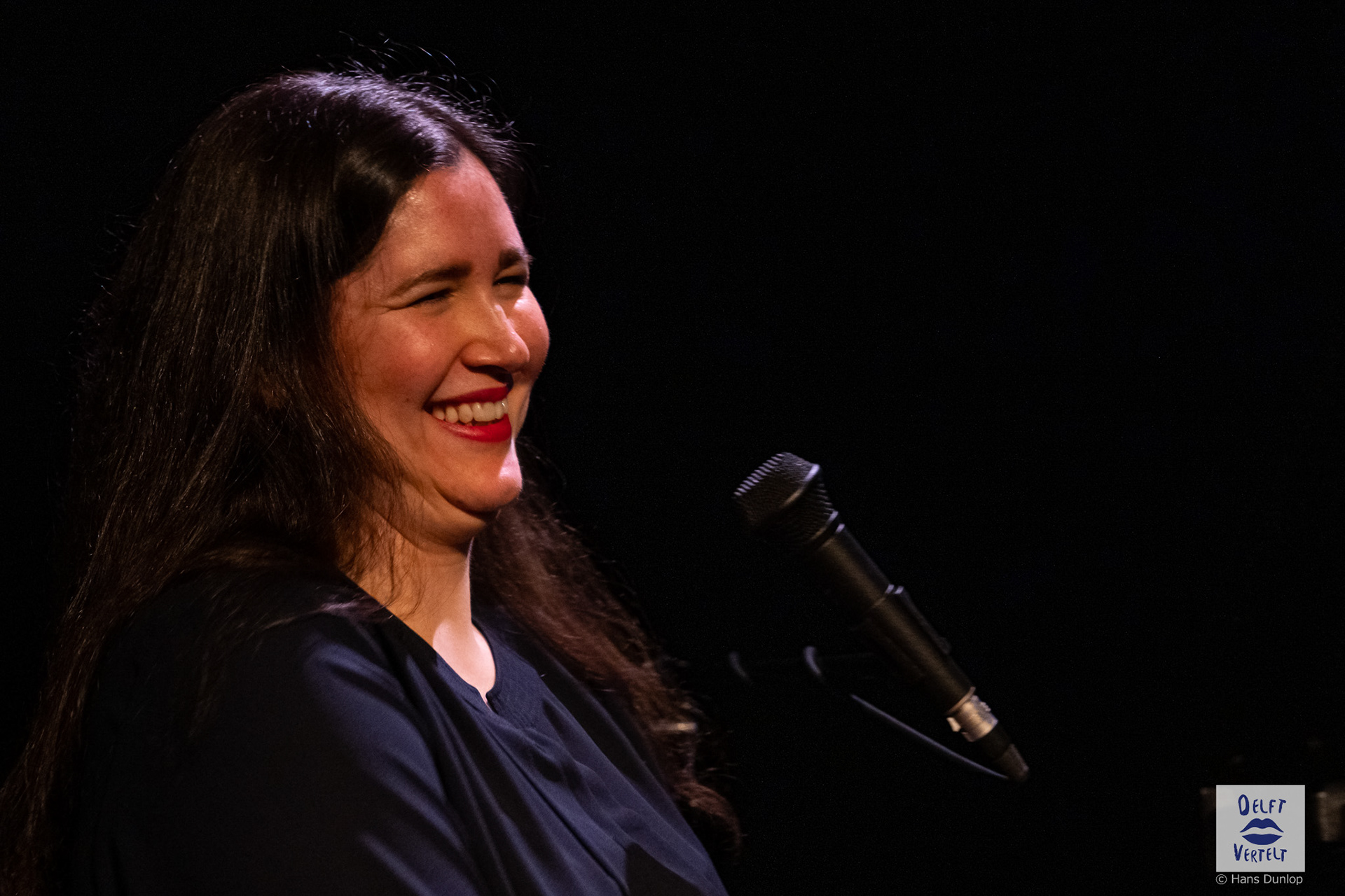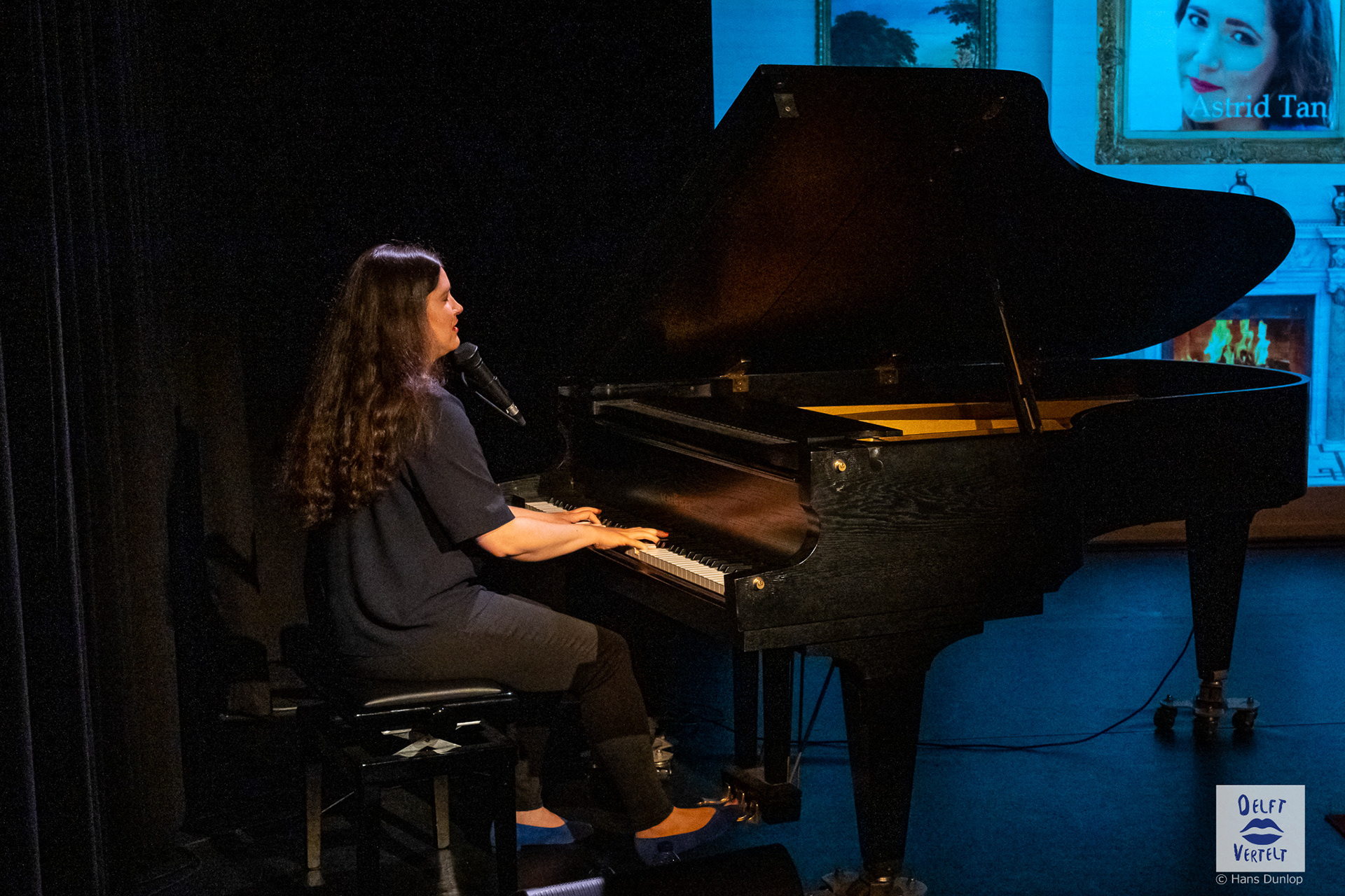 Een impressie van de 20e voorstelling van Delft Vertelt in het Rietveld Theater met Tjan van Loenen, Séphine Laros, Ric Berretty, Astrid Tan en Dick Stammes.