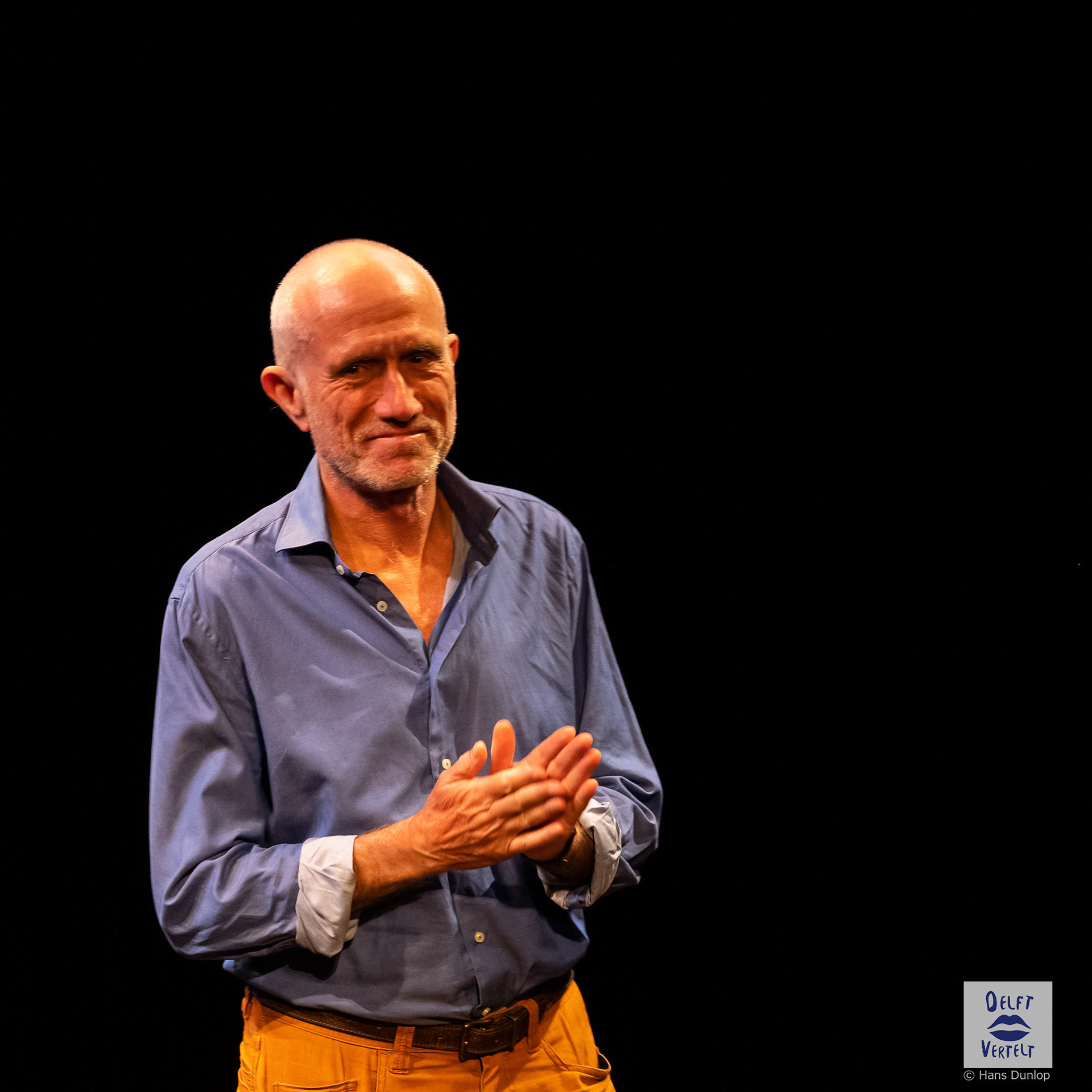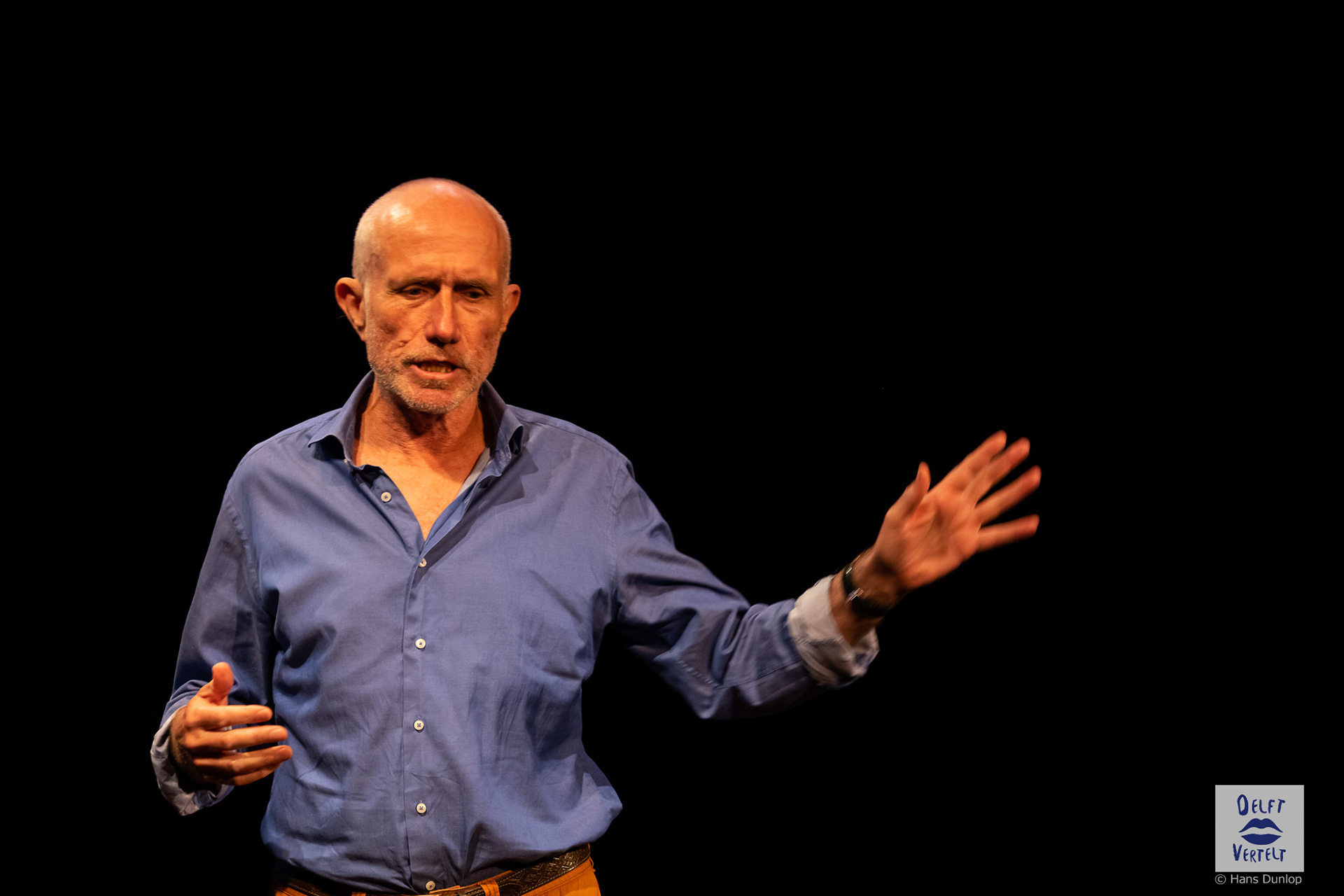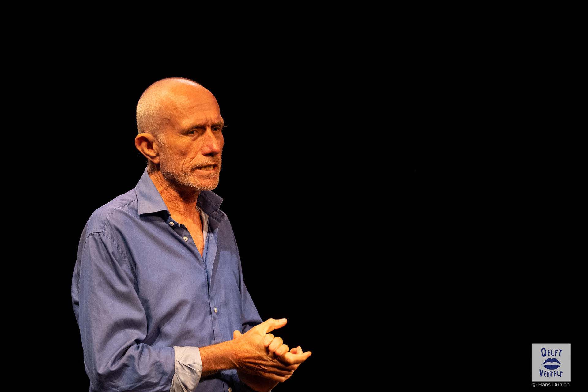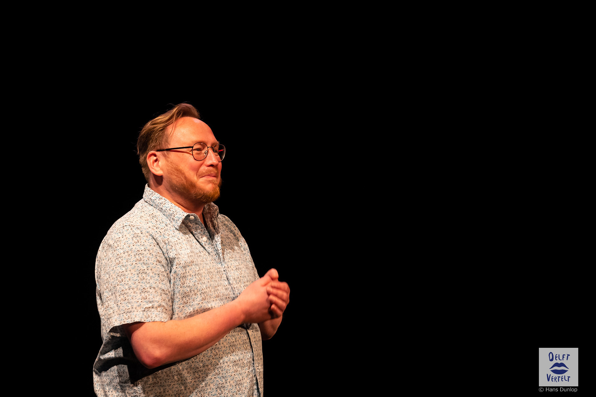 Een impressie van de 20e voorstelling van Delft Vertelt in het Rietveld Theater met Tjan van Loenen, Séphine Laros, Ric Berretty, Astrid Tan en Dick Stammes.
