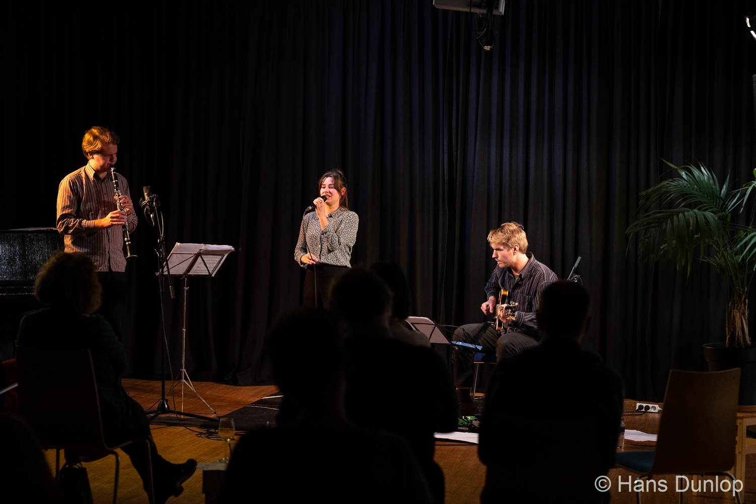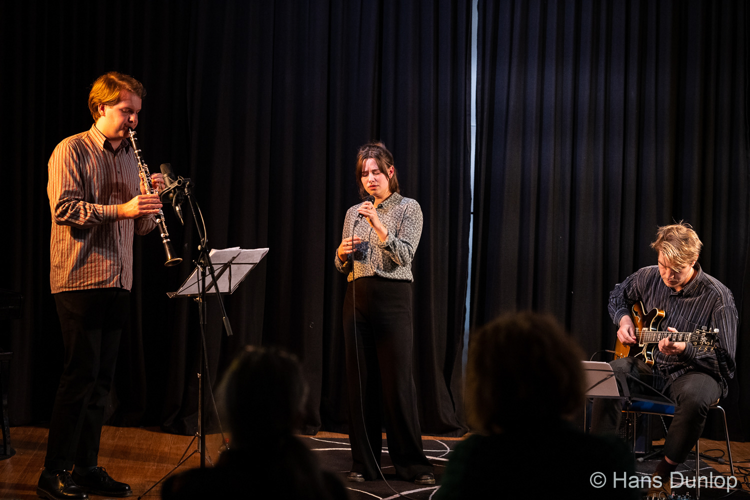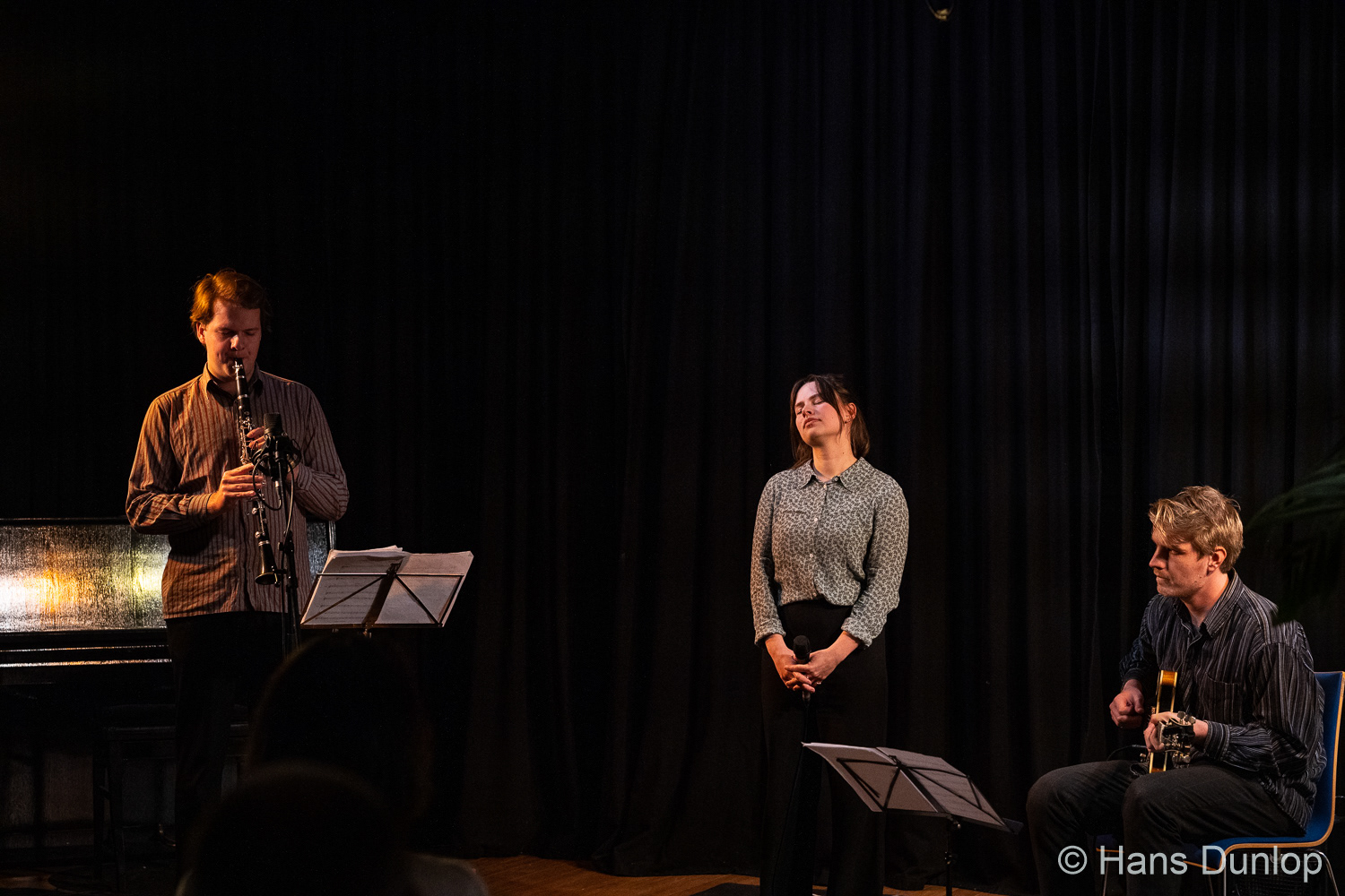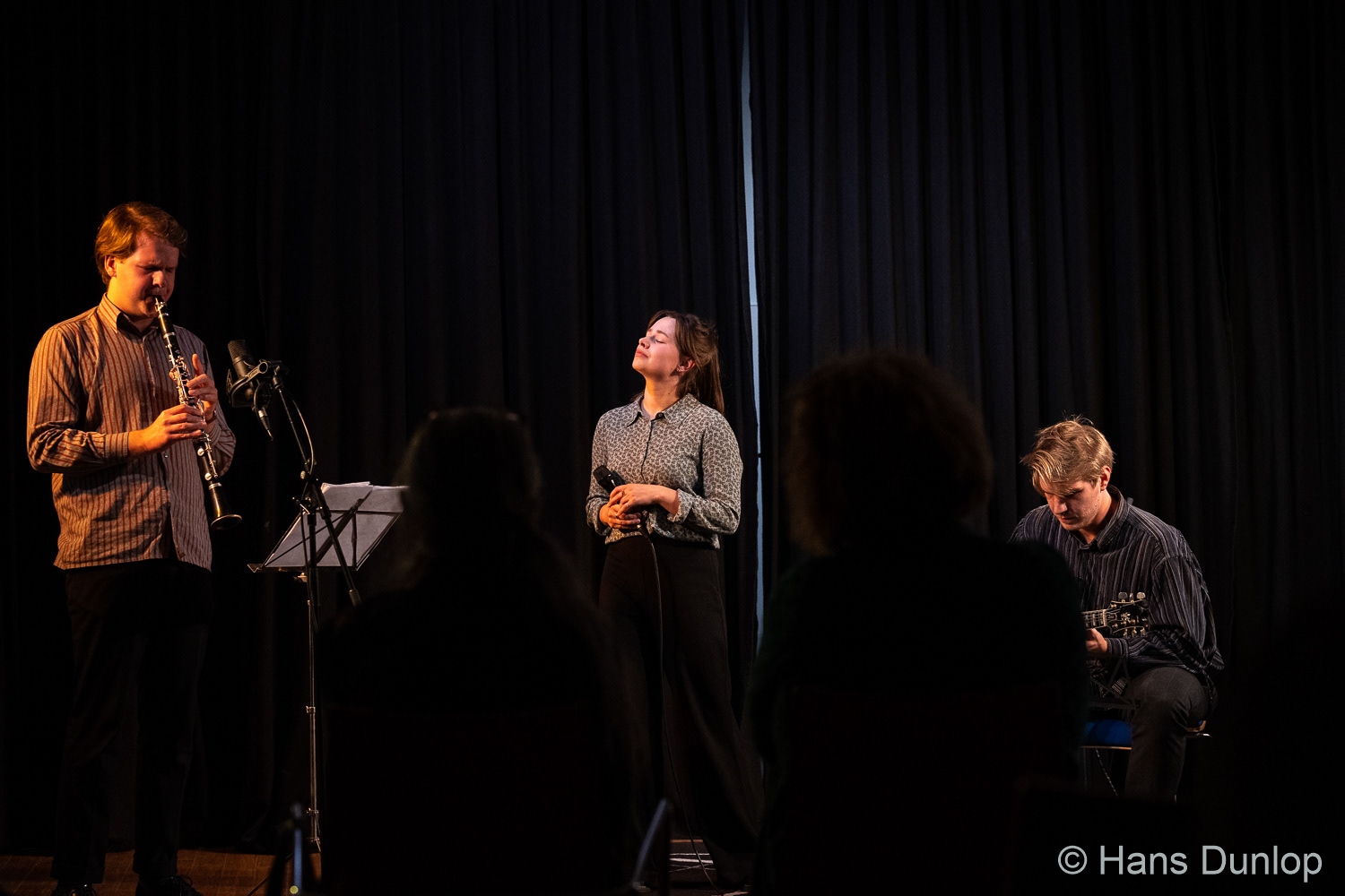 Het Nina Rompa trio met Nina Rompa (vocals), Gijs Idema (gitaar) en Mo van der Does (klarinet) tijdens hun optreden op 14 oktober 2021 in het Prinsenkwartier.