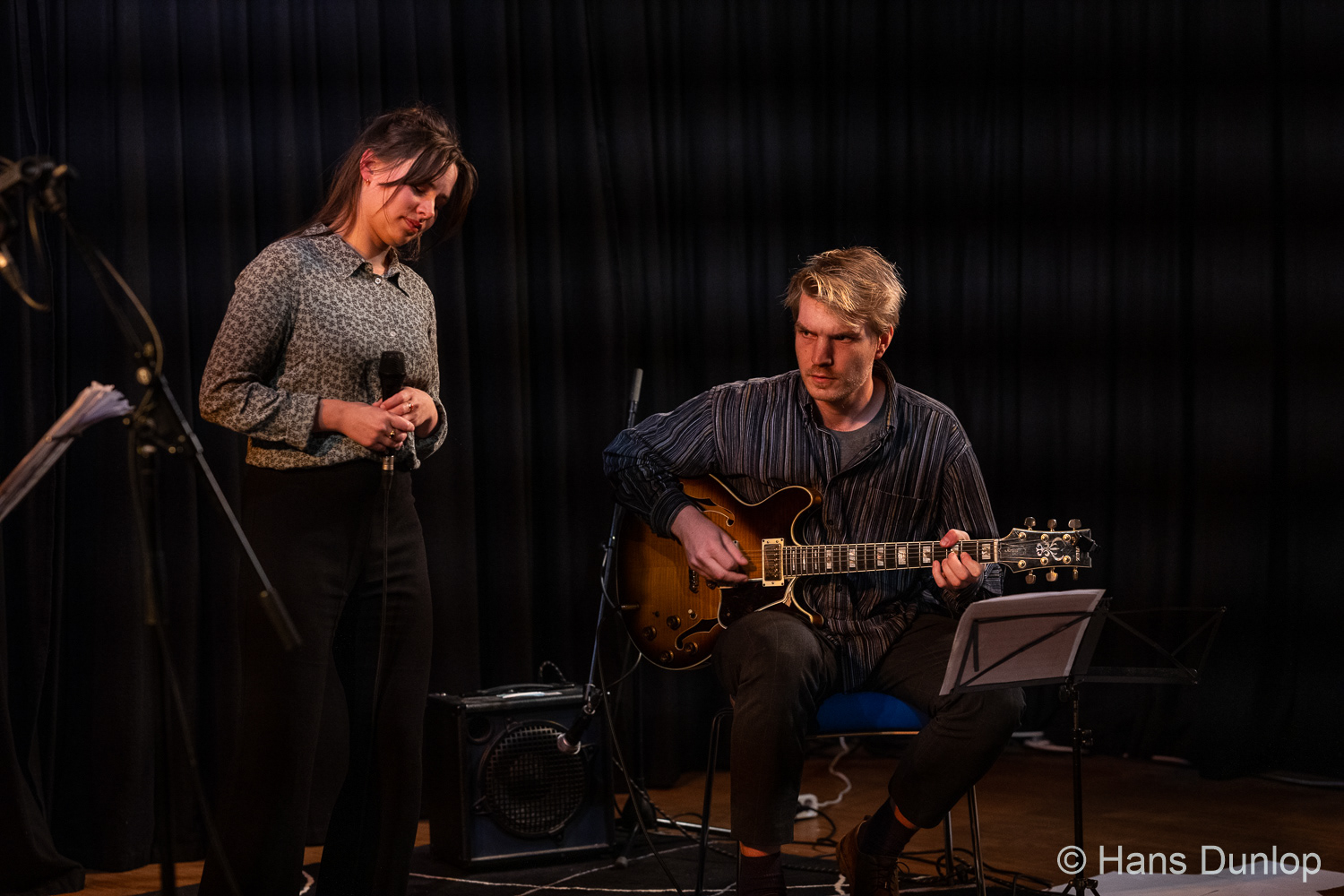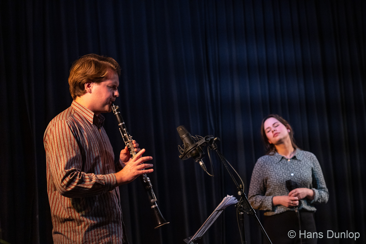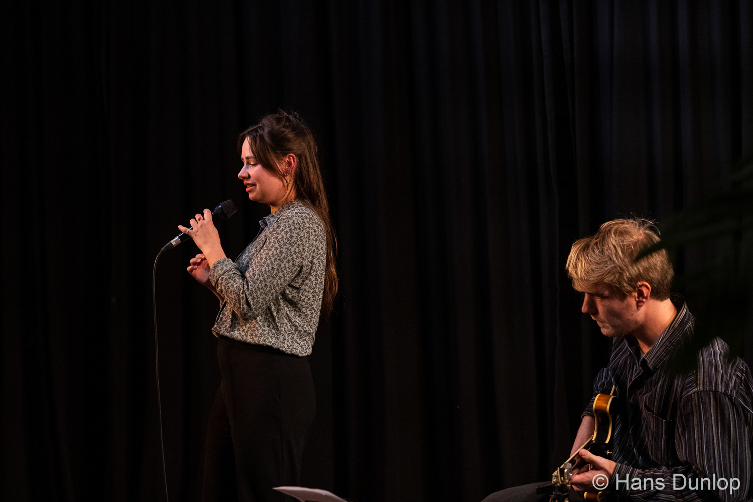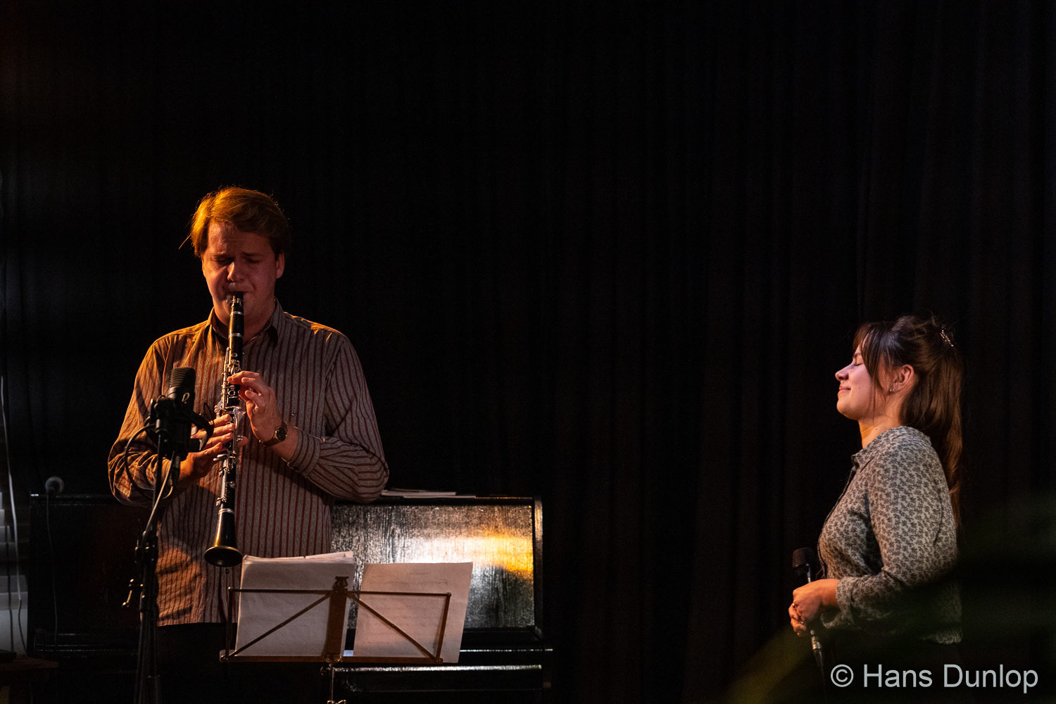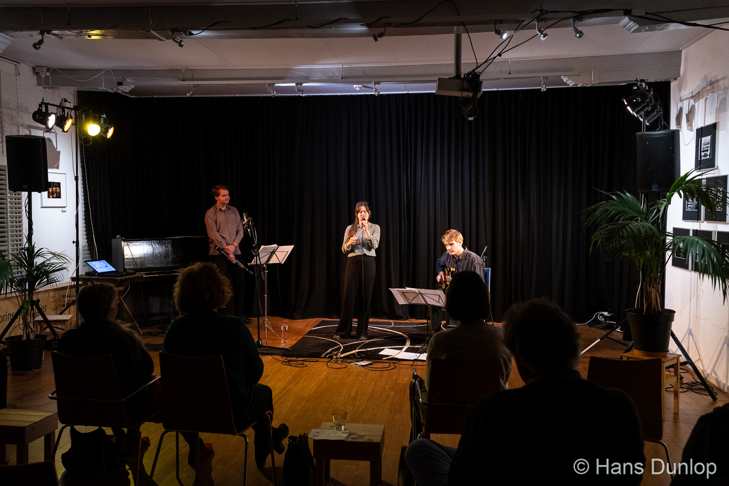 Het Nina Rompa trio met Nina Rompa (vocals), Gijs Idema (gitaar) en Mo van der Does (klarinet) tijdens hun optreden op 14 oktober 2021 in het Prinsenkwartier.
