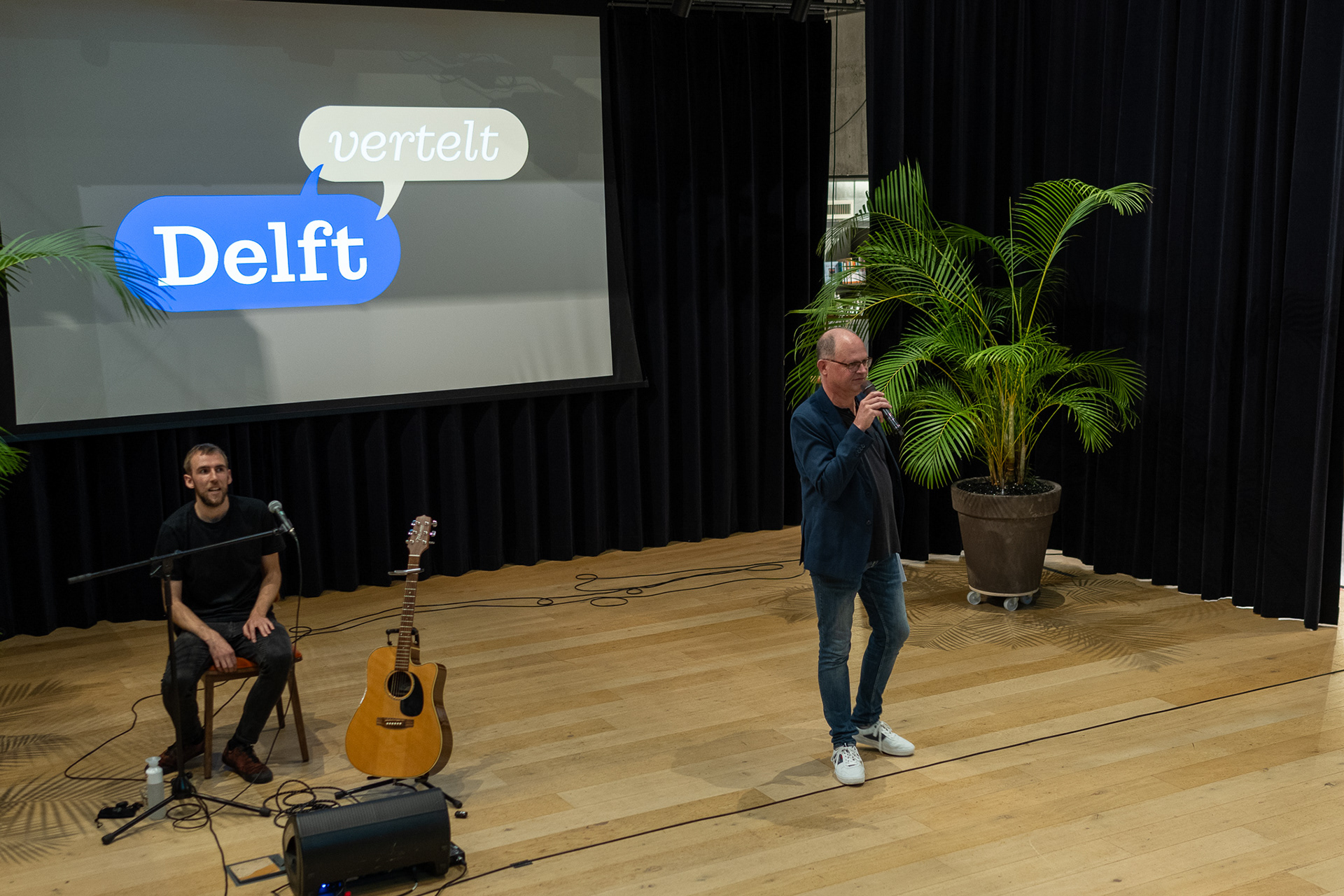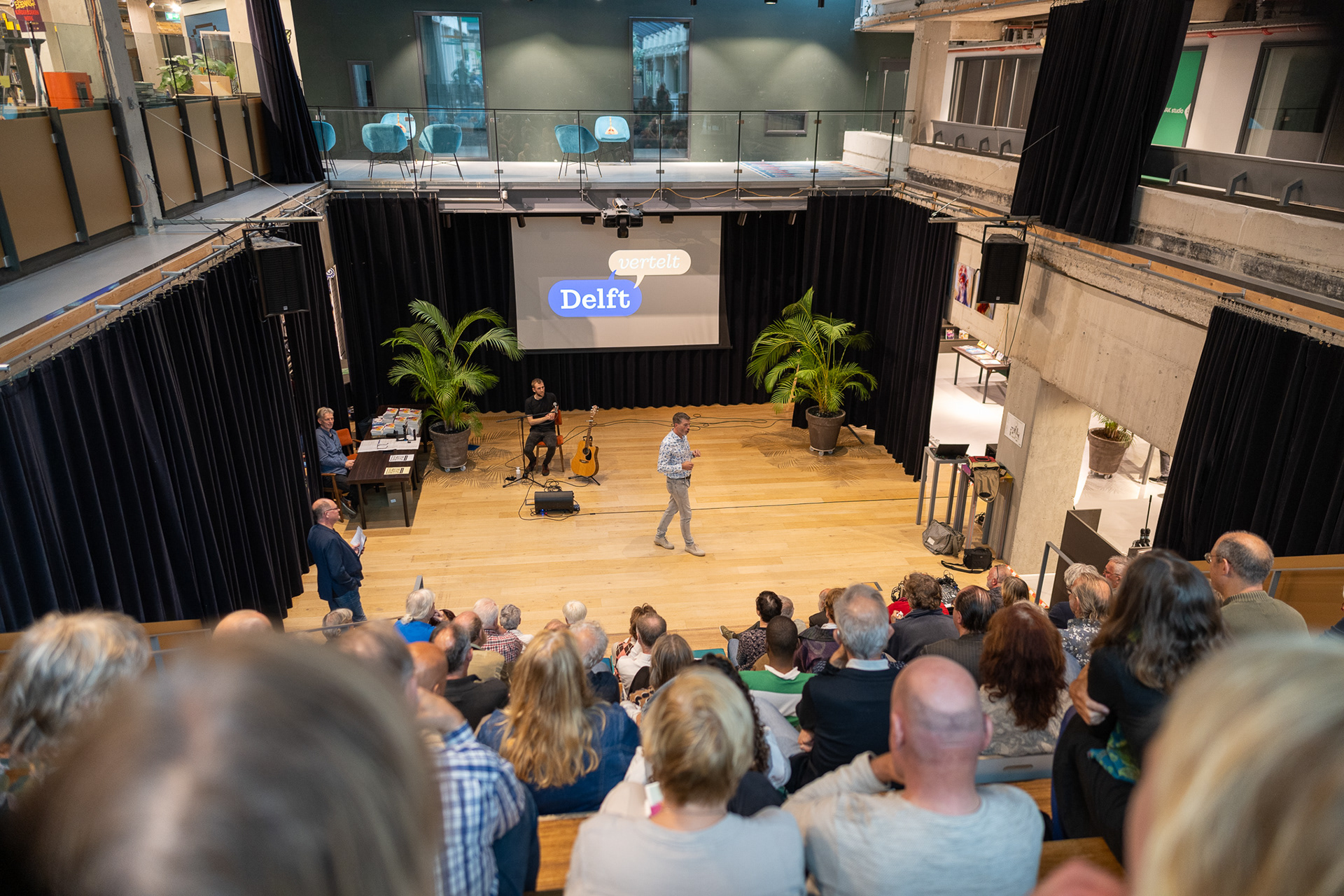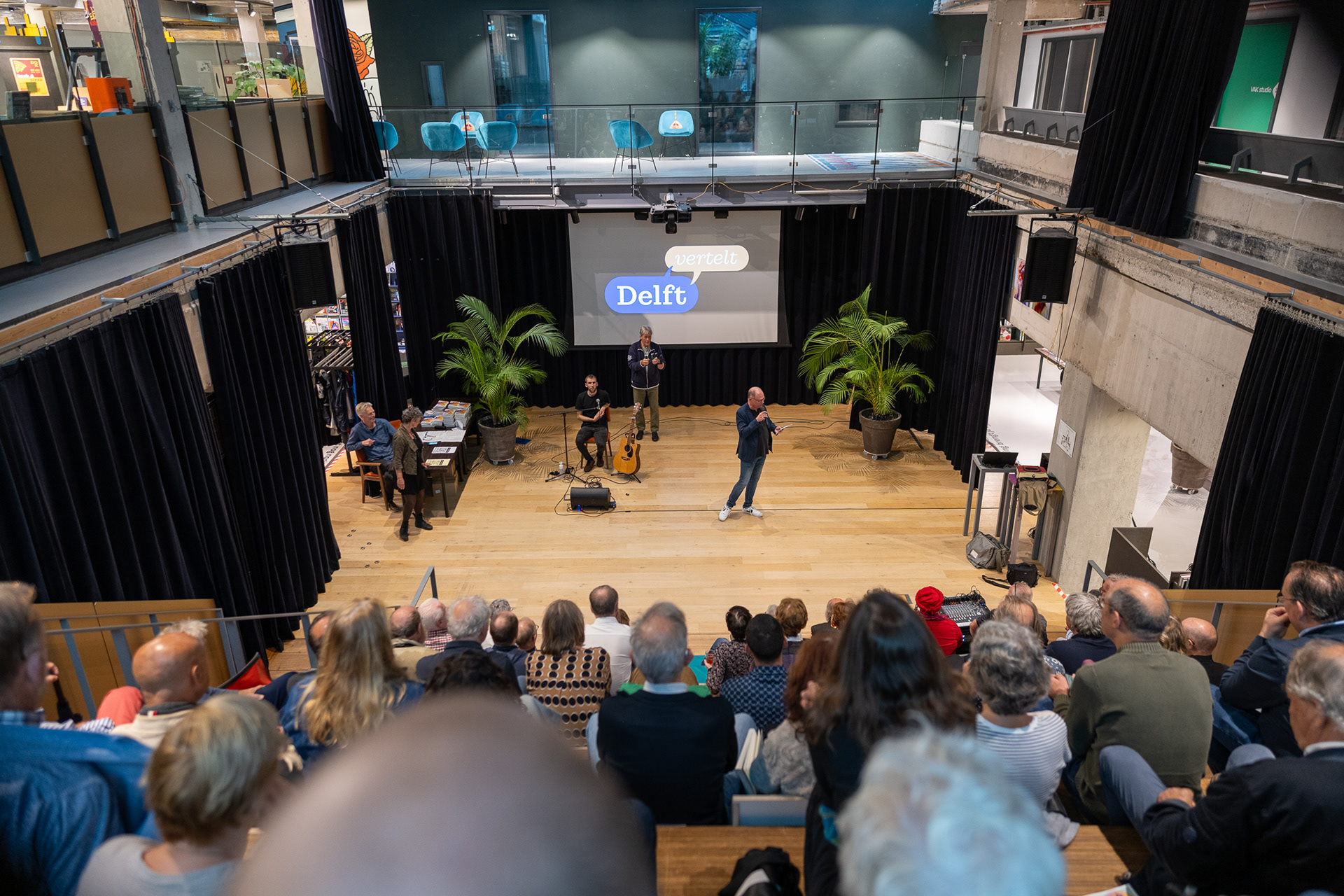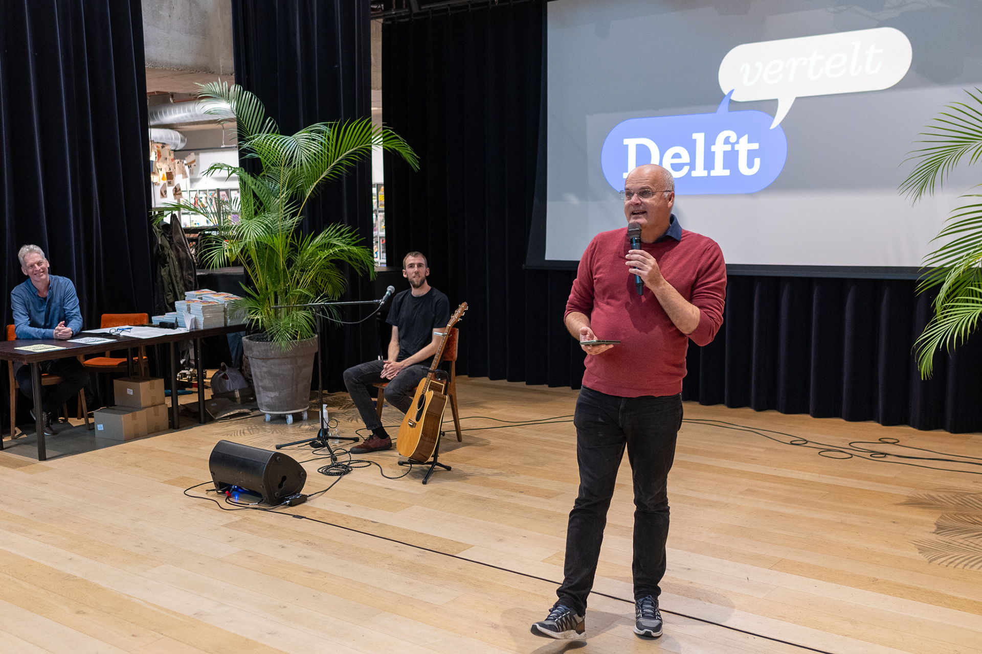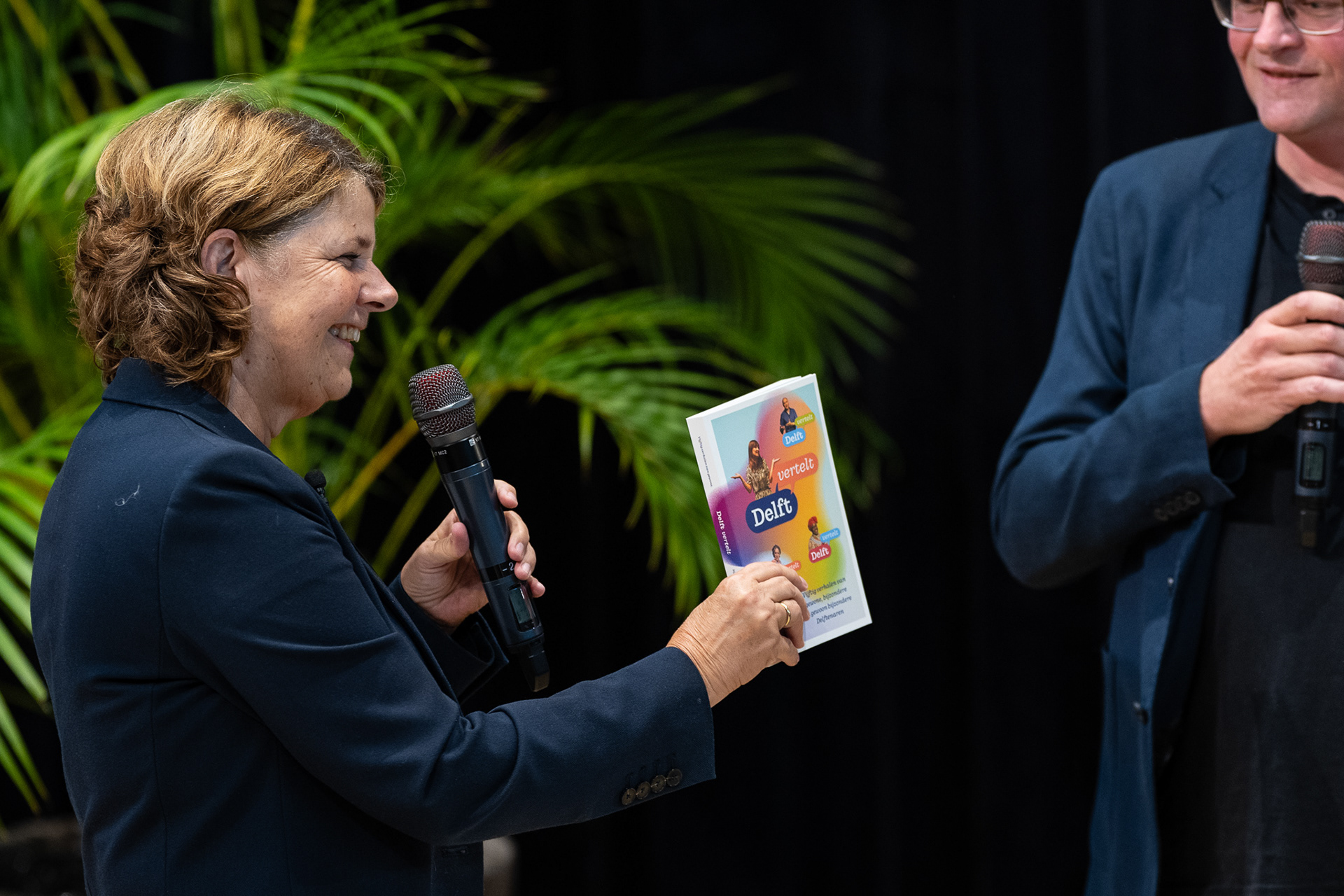 Een impressie van de presentatie van het boek Delft Vertelt op 27 september 2024 in OPEN, met: Dick Stammes; Feico Dillema; Gerard Jellema; Joke Kouwenhoven; Burgemeester Marja van Bijsterveldt; Nico Jouwe; Olmo van der Mast; Willem de Bie;