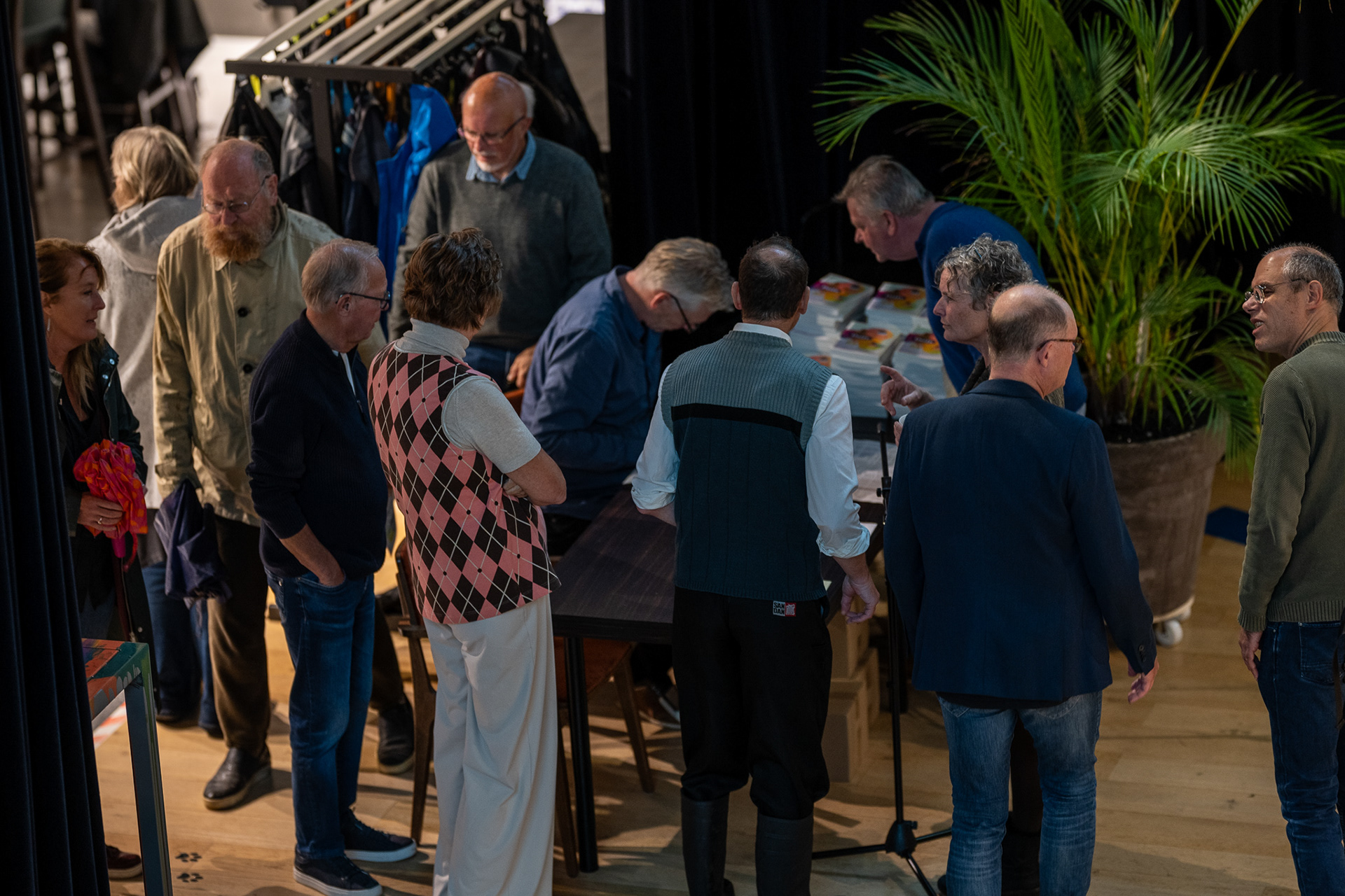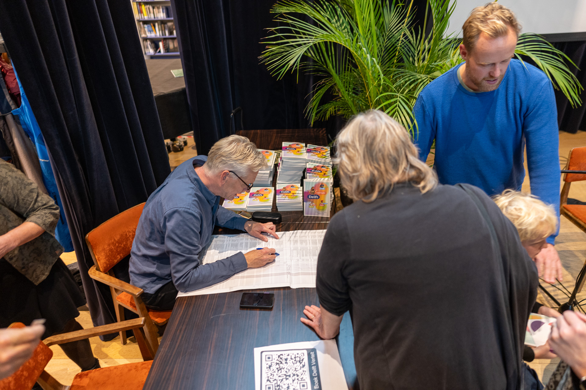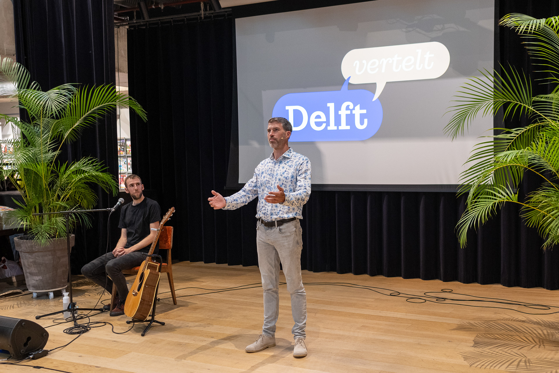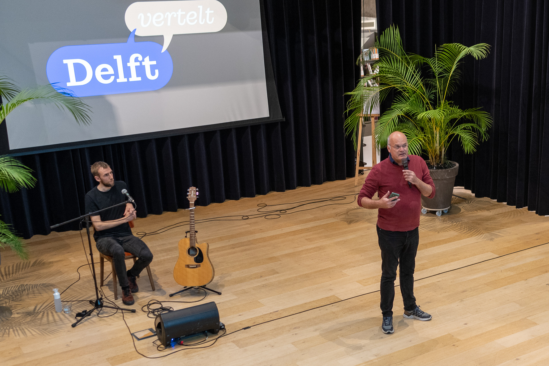 Een impressie van de presentatie van het boek Delft Vertelt op 27 september 2024 in OPEN, met: Dick Stammes; Feico Dillema; Gerard Jellema; Joke Kouwenhoven; Burgemeester Marja van Bijsterveldt; Nico Jouwe; Olmo van der Mast; Willem de Bie;