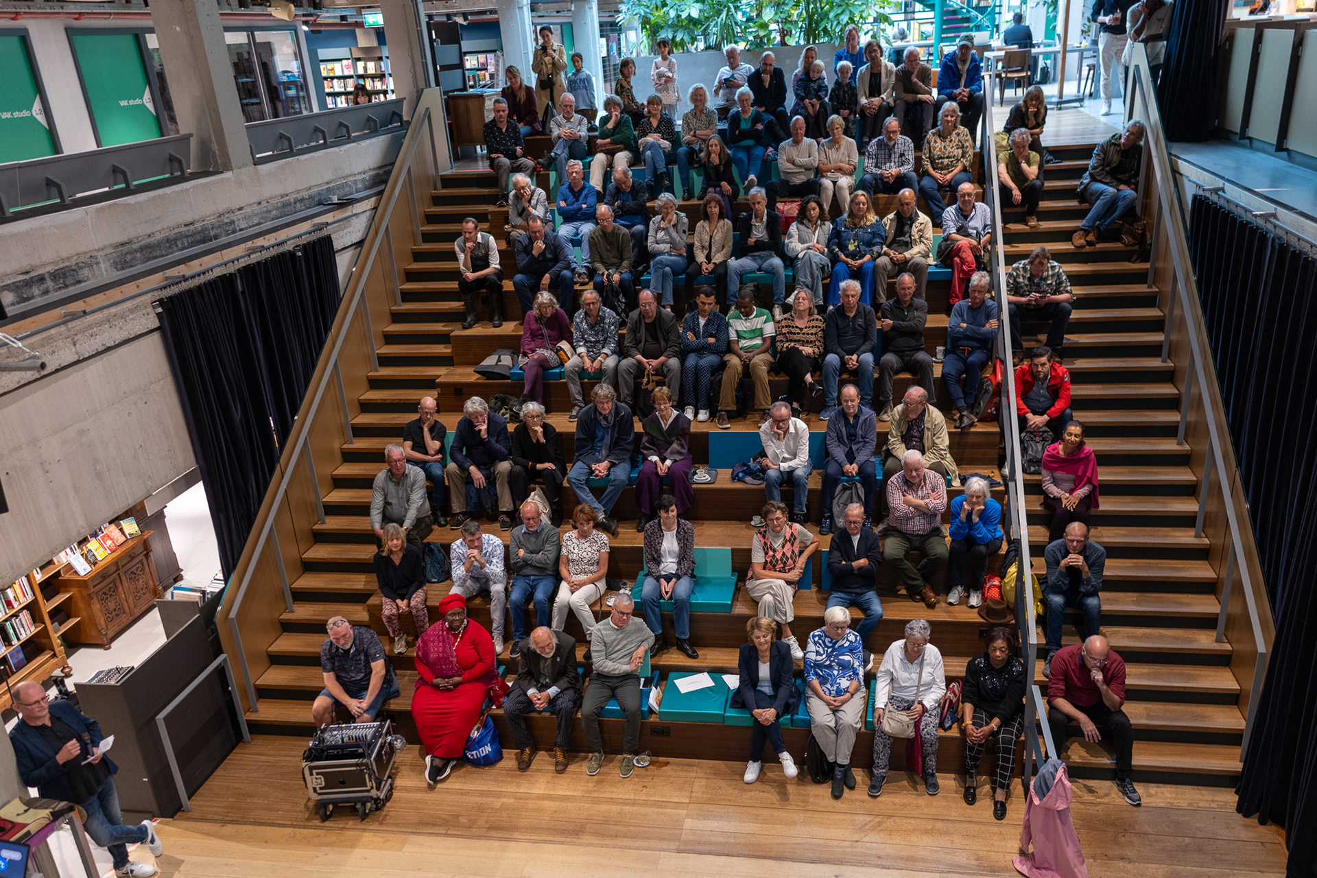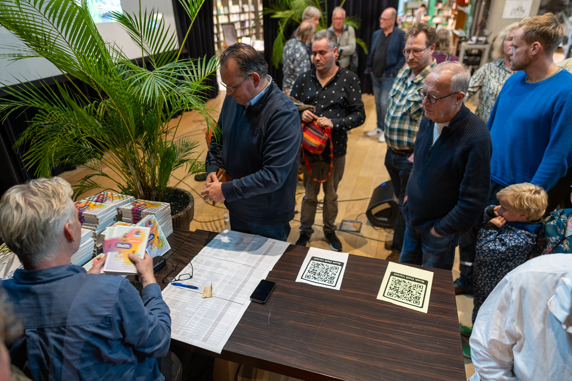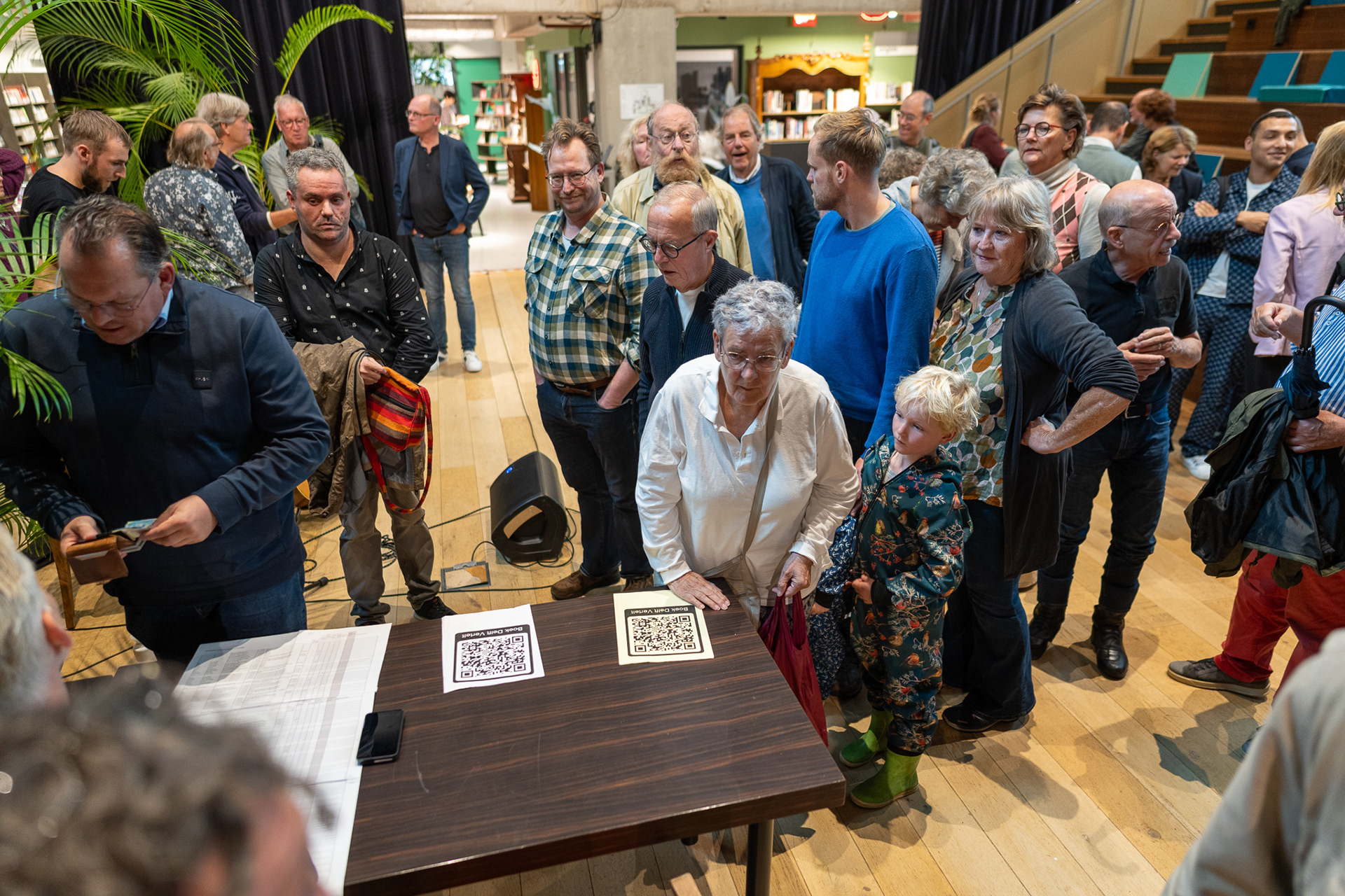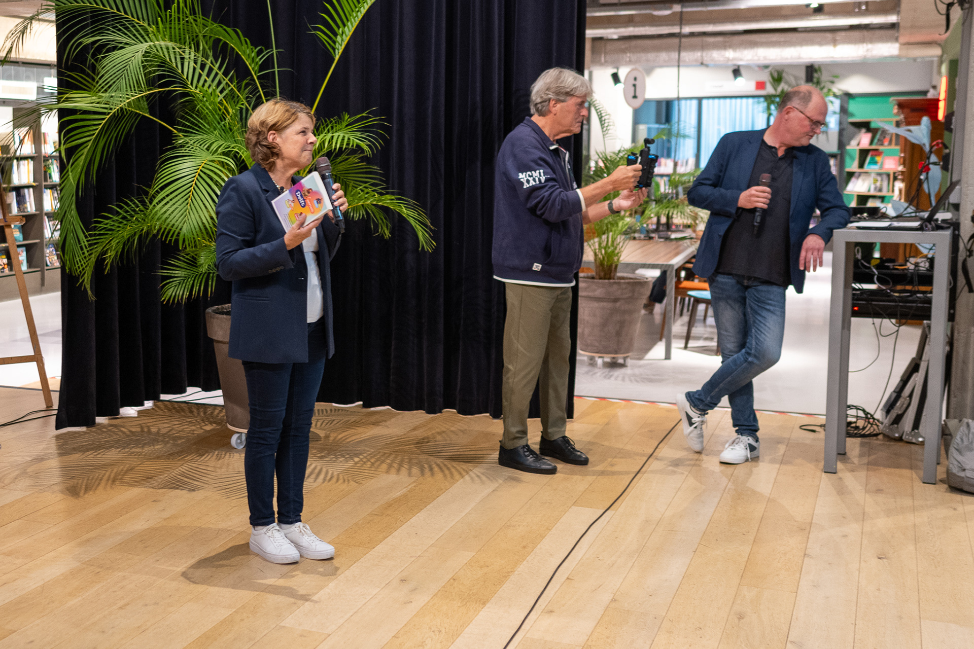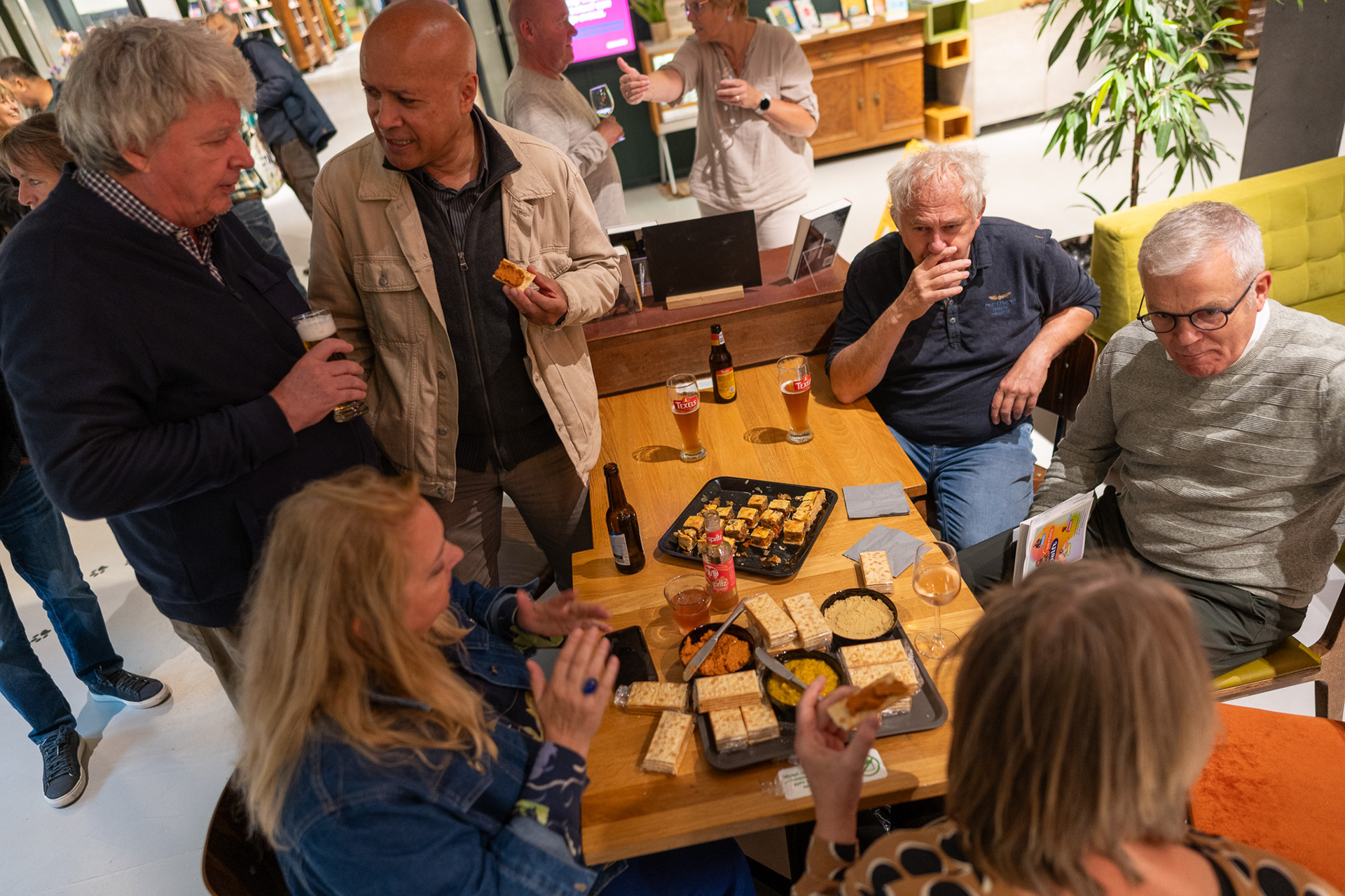 Een impressie van de presentatie van het boek Delft Vertelt op 27 september 2024 in OPEN, met: Dick Stammes; Feico Dillema; Gerard Jellema; Joke Kouwenhoven; Burgemeester Marja van Bijsterveldt; Nico Jouwe; Olmo van der Mast; Willem de Bie;