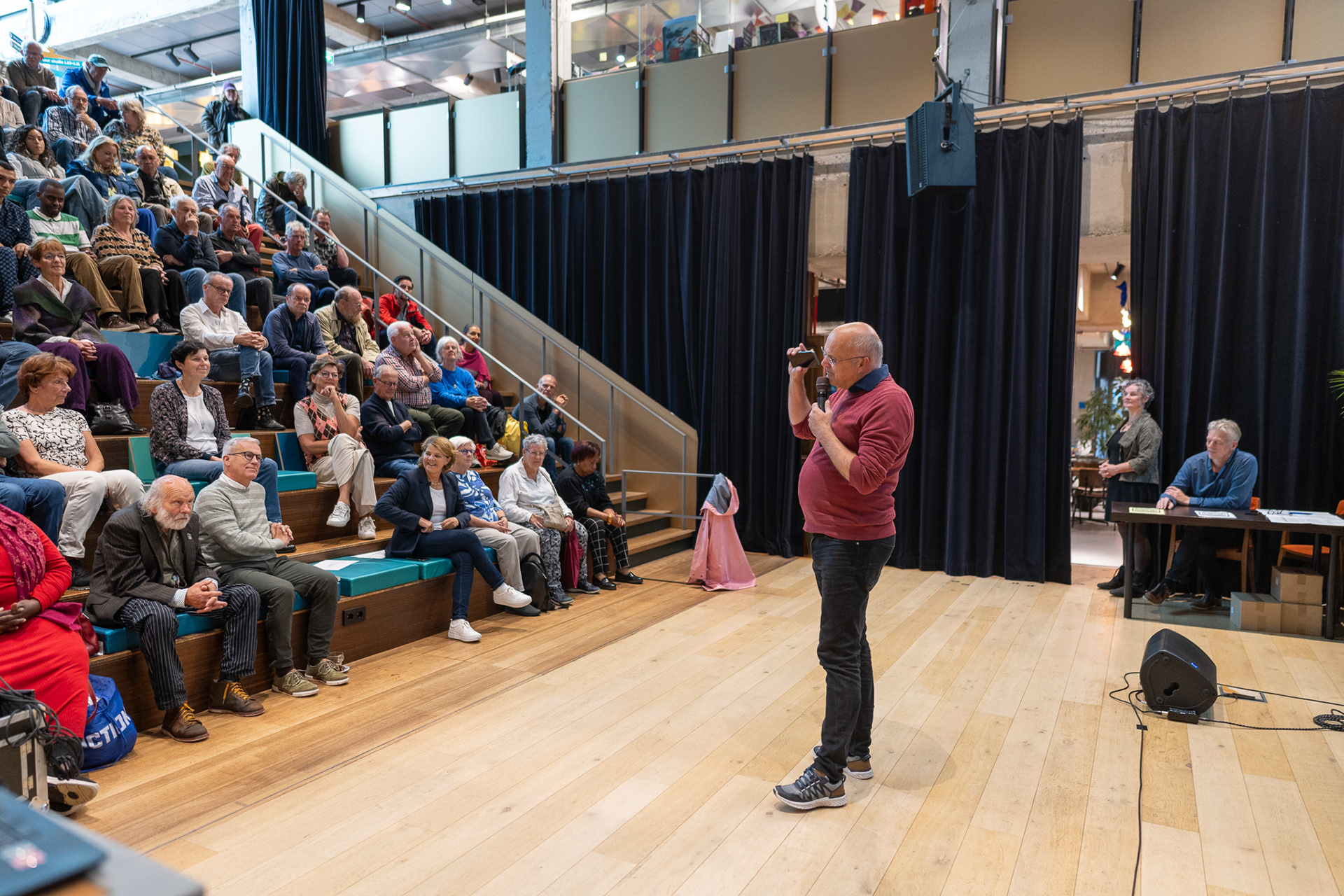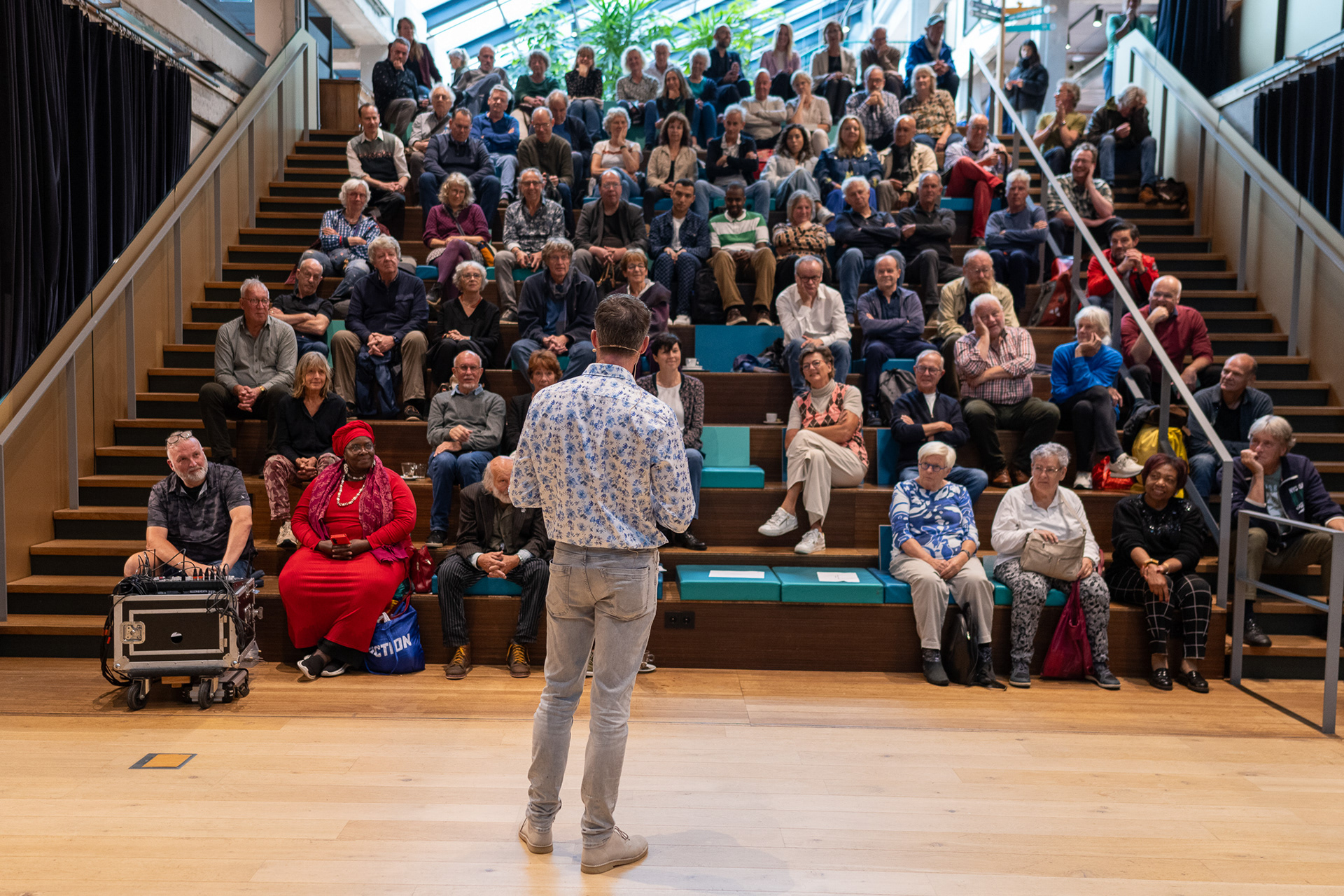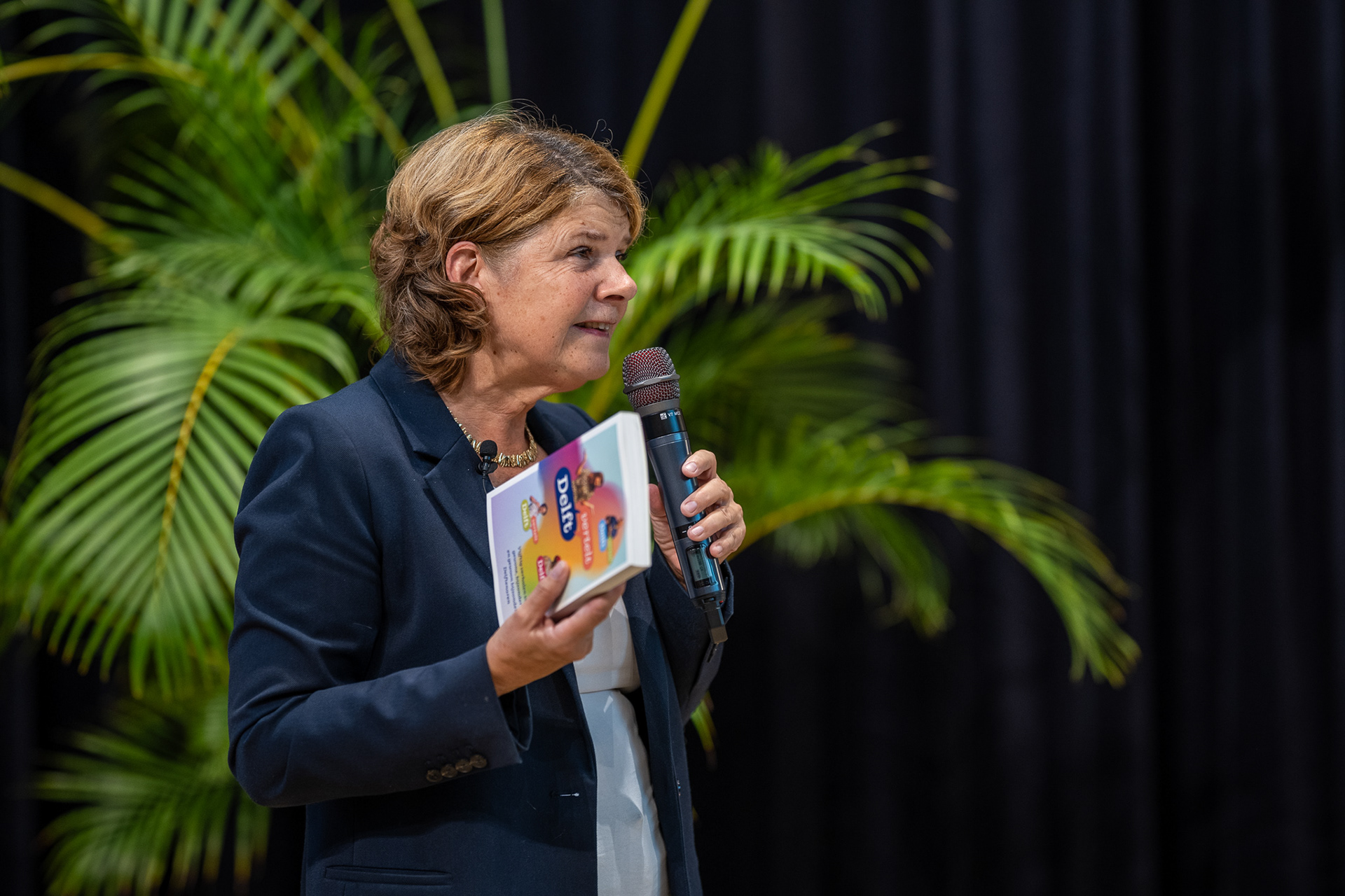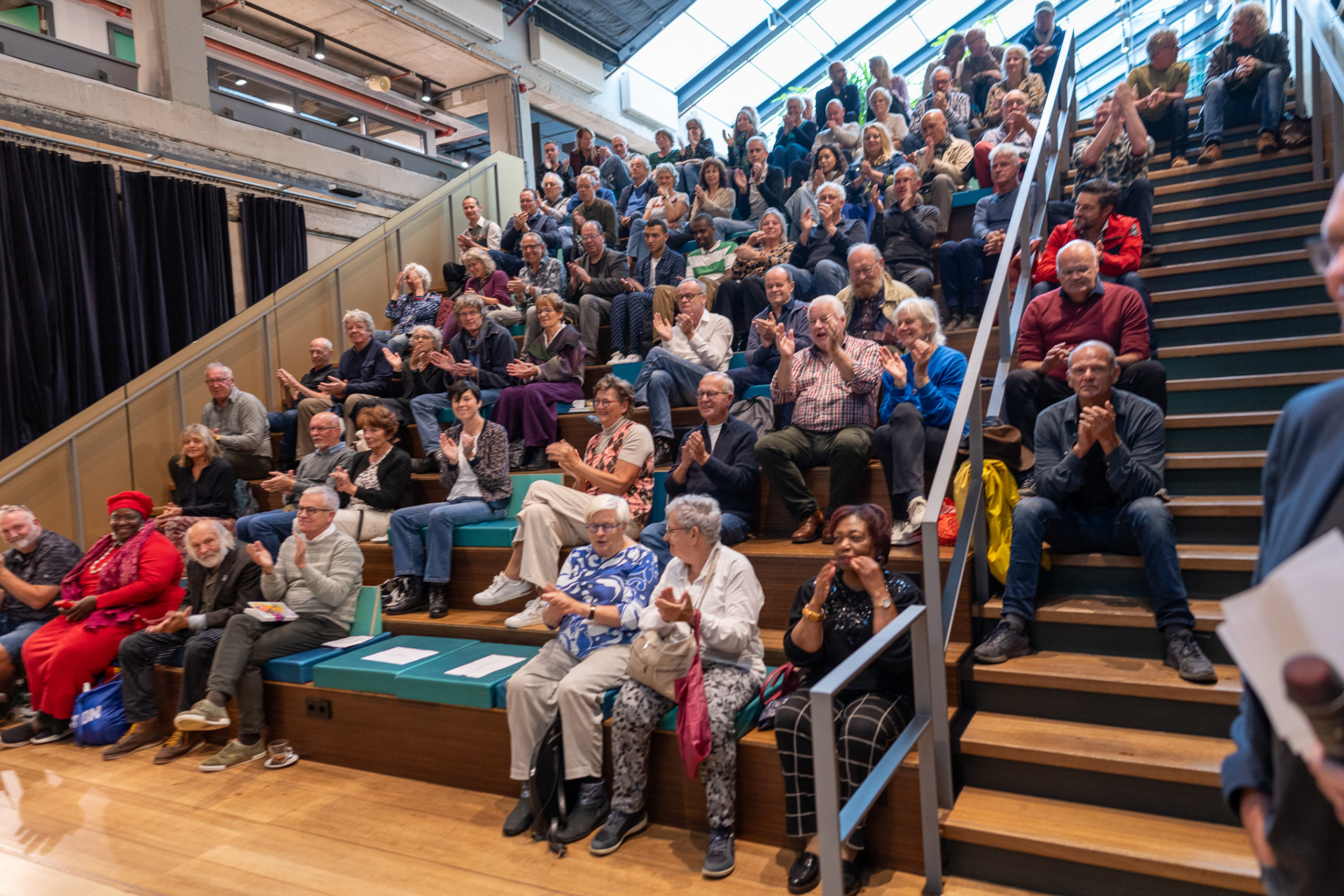 Een impressie van de presentatie van het boek Delft Vertelt op 27 september 2024 in OPEN, met: Dick Stammes; Feico Dillema; Gerard Jellema; Joke Kouwenhoven; Burgemeester Marja van Bijsterveldt; Nico Jouwe; Olmo van der Mast; Willem de Bie;