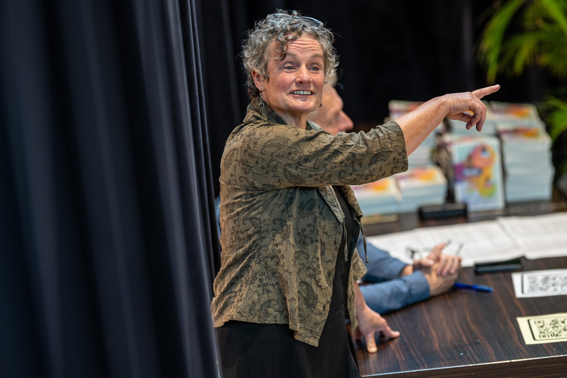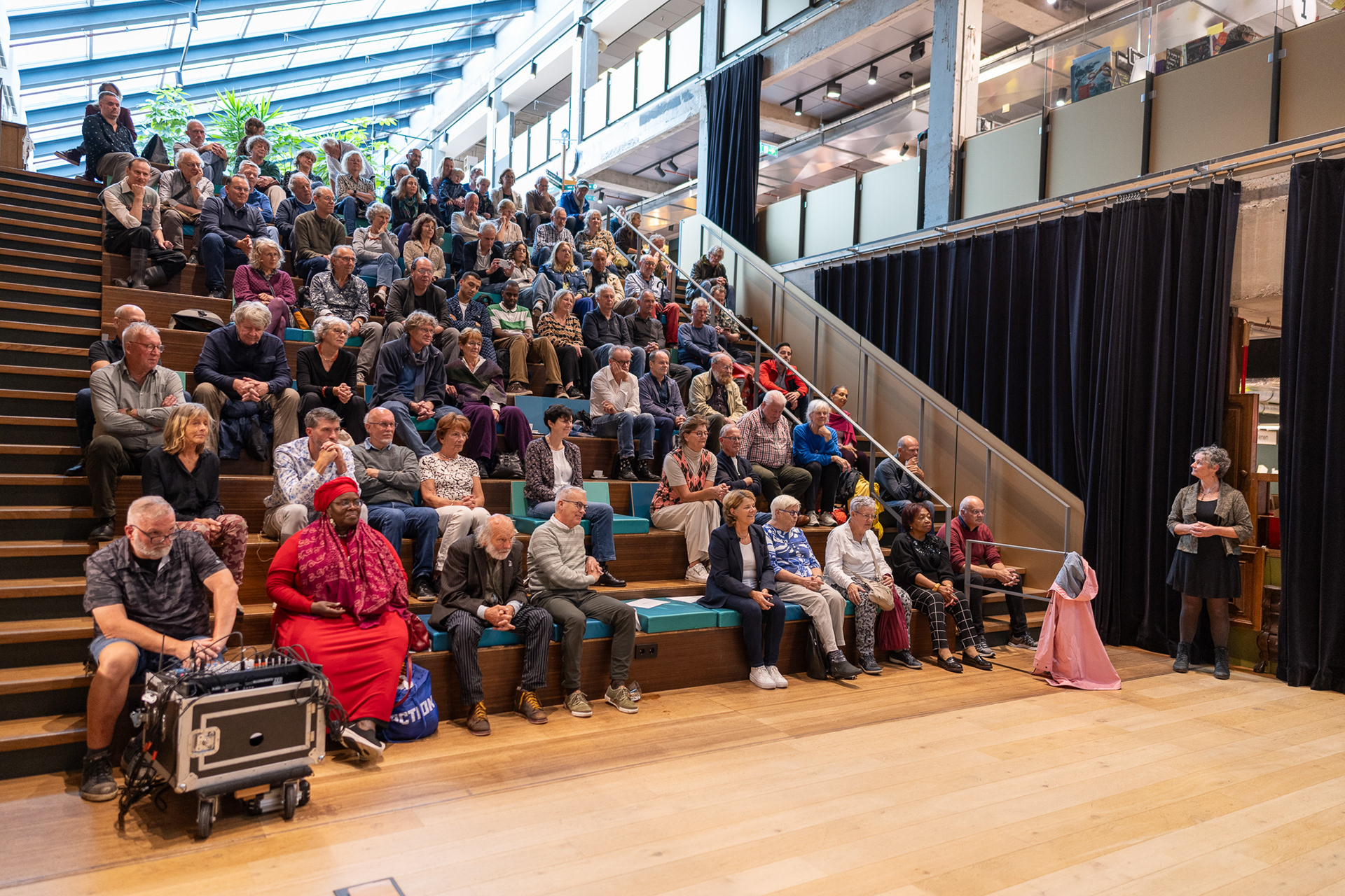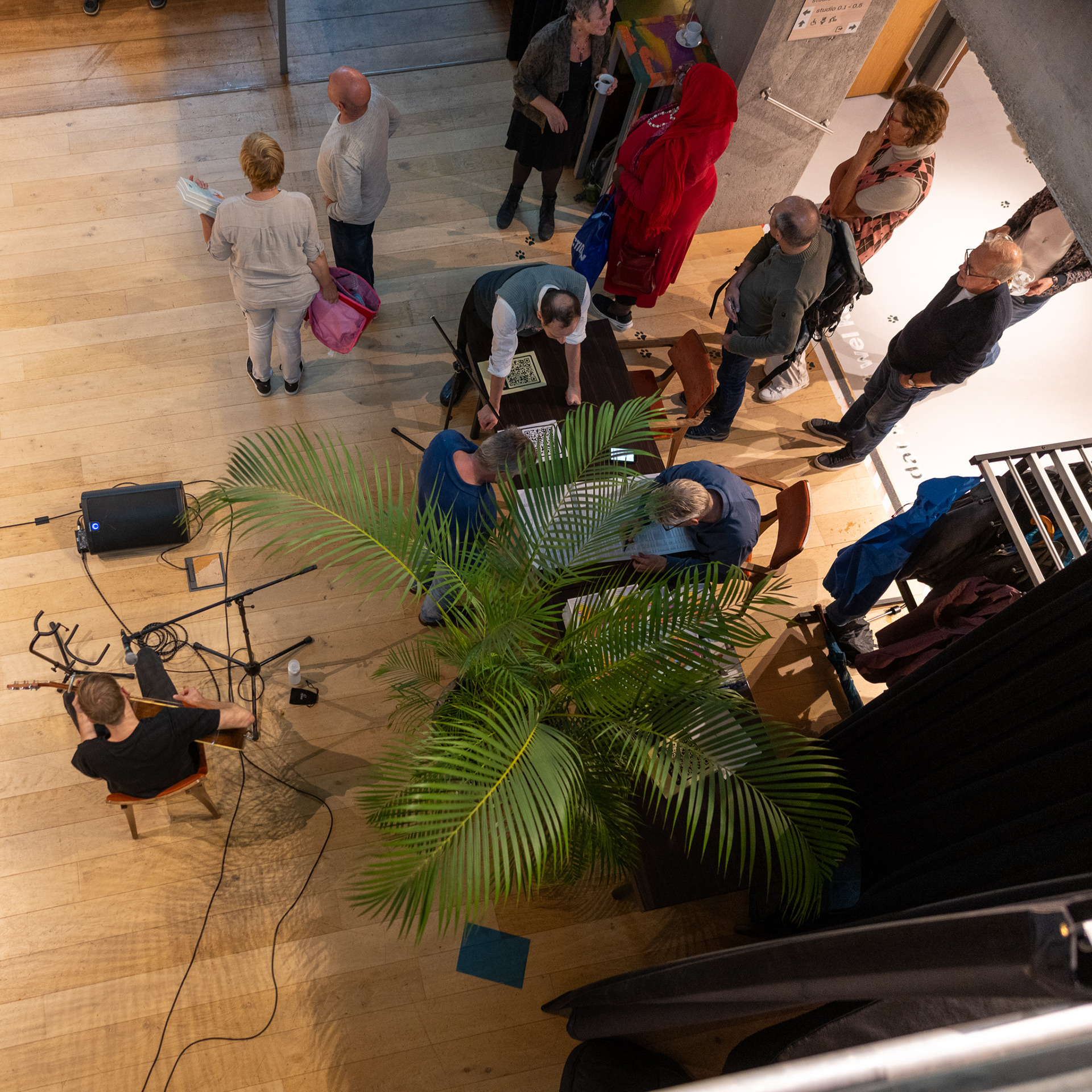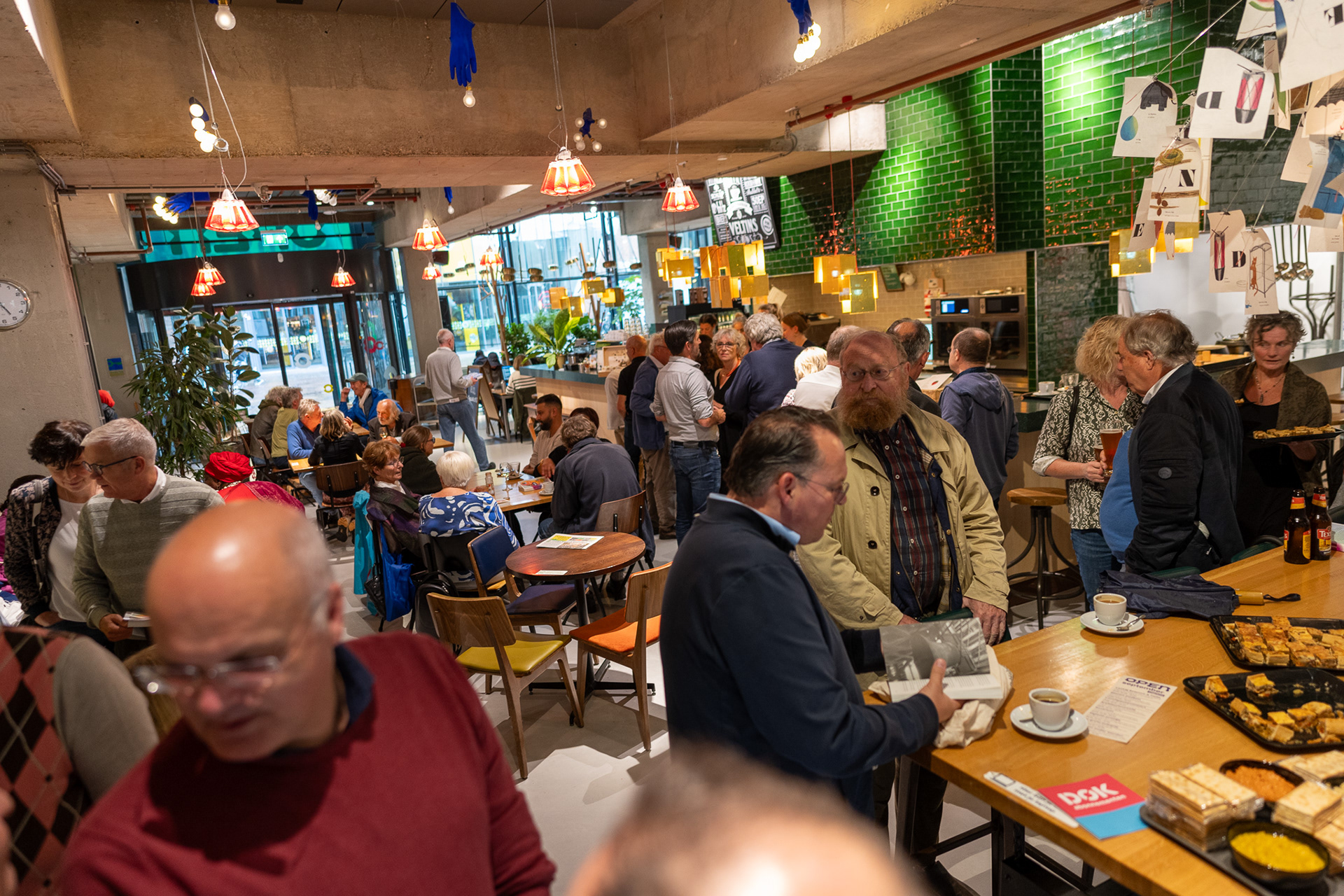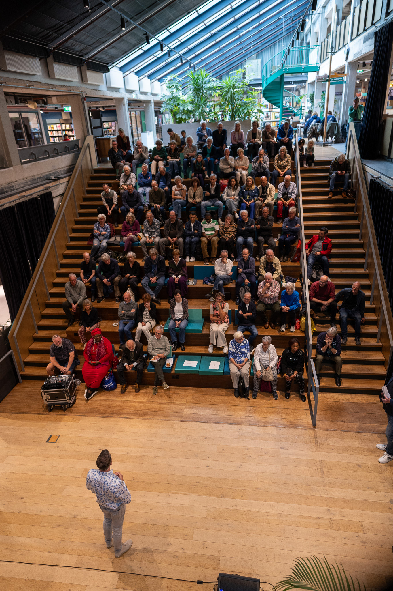 Een impressie van de presentatie van het boek Delft Vertelt op 27 september 2024 in OPEN, met: Dick Stammes; Feico Dillema; Gerard Jellema; Joke Kouwenhoven; Burgemeester Marja van Bijsterveldt; Nico Jouwe; Olmo van der Mast; Willem de Bie;